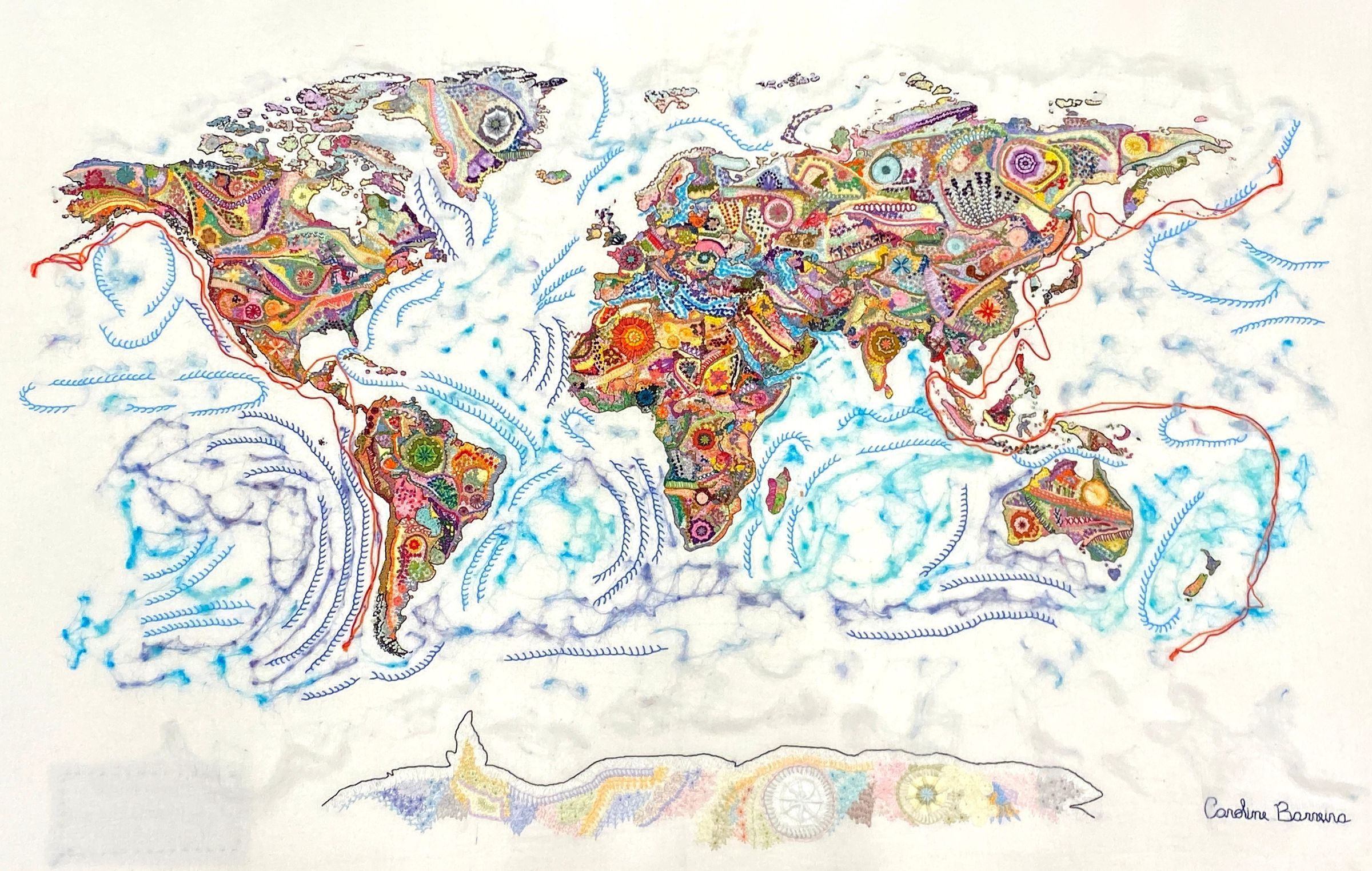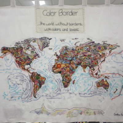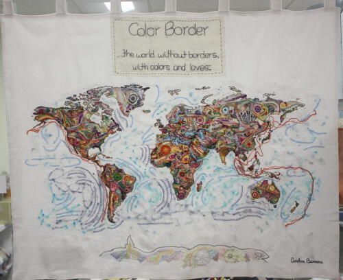 A stitched map of the world without borders in a variety of surface embroidery stitches and colors. The map was made for the February 2019 exhibition, Stitch-at-Home Challenge: Borders, by Caroline Barriera of Sao Paolo, Brazil. The stitched inscription reads: