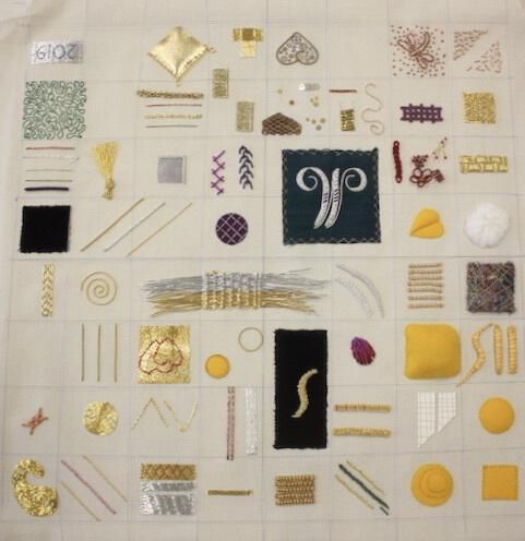 Metalwork sampler. Made by the donor, Marian Drum, for her San Francisco School of Needlework and Design course, Comprehensive Studies in Hand Embroidery: Metalwork Level 1.Made/Created