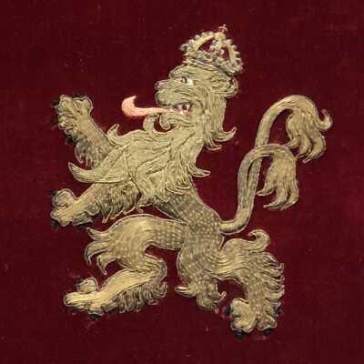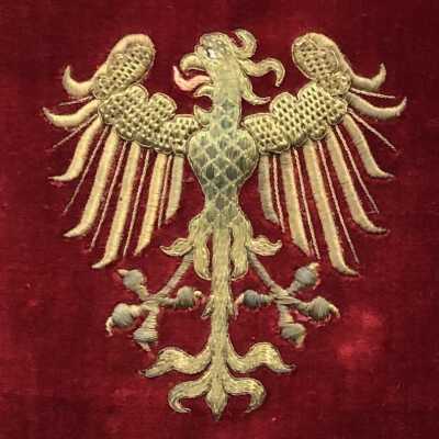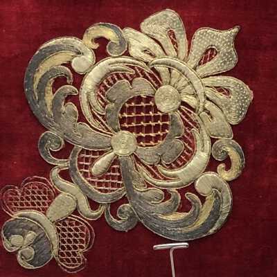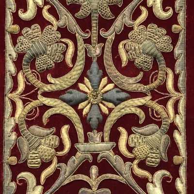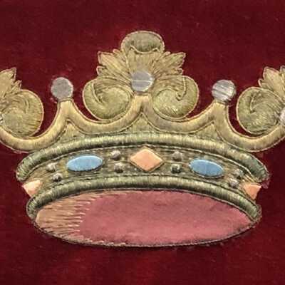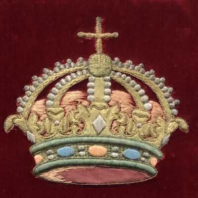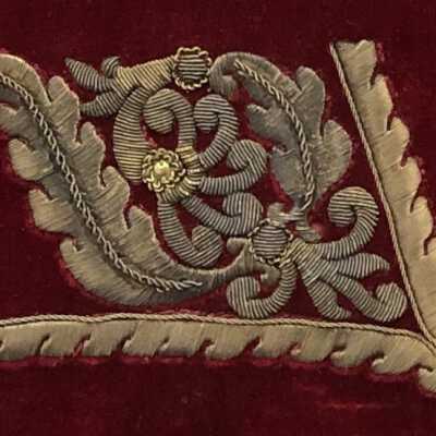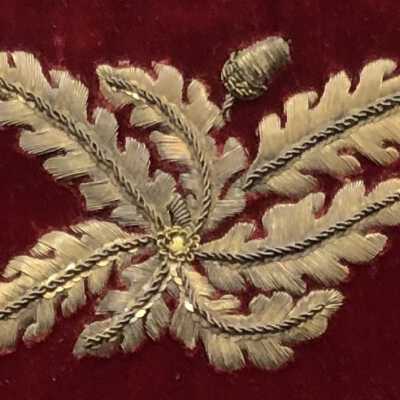 Swedish Royal Gold Thread Embroidery Sampler stitched by Nina Ulrika Sohlberg of Stockholm, Sweden, c. 1890. Gold thread on deep red velvet ground; seven individual motifs surrounding a central floral rectangular motif and one vertical bar stitched of gold metal thread stitched over card. Individual motifs include, two crowns, an acorn with leaves, a phoenix, a heraldic lion, a pomegranate, a laurel leaf and the maker’s cipher, N/S in the lower left corner. Framed.Collection