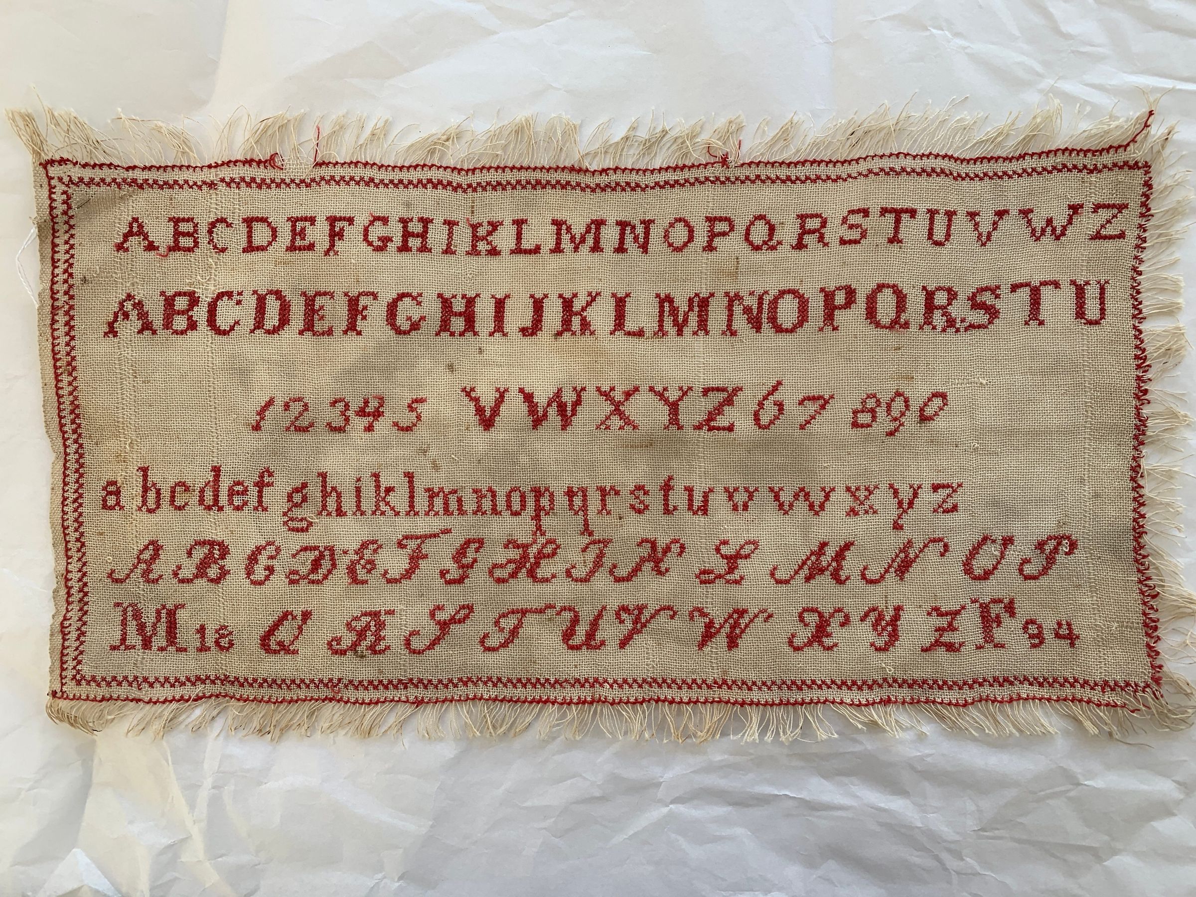 Redwork cross stitch alphabet sampler cross stitch border and blanket stitch supporting the fringed edging. Cotton threads on linen ground. Dated 1894. There are 2 capital letter print fonts and one lower case print font. There are numbers one to zero, and a script font. The initials M/F appear on the sampler.Made/Created