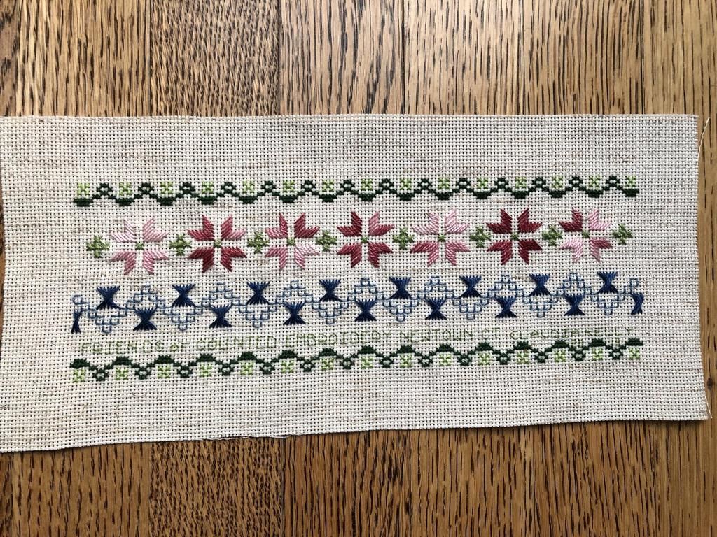 Sampler in counted thread with a pink floral band, a sawtooth band and a top and bottom borderCollection