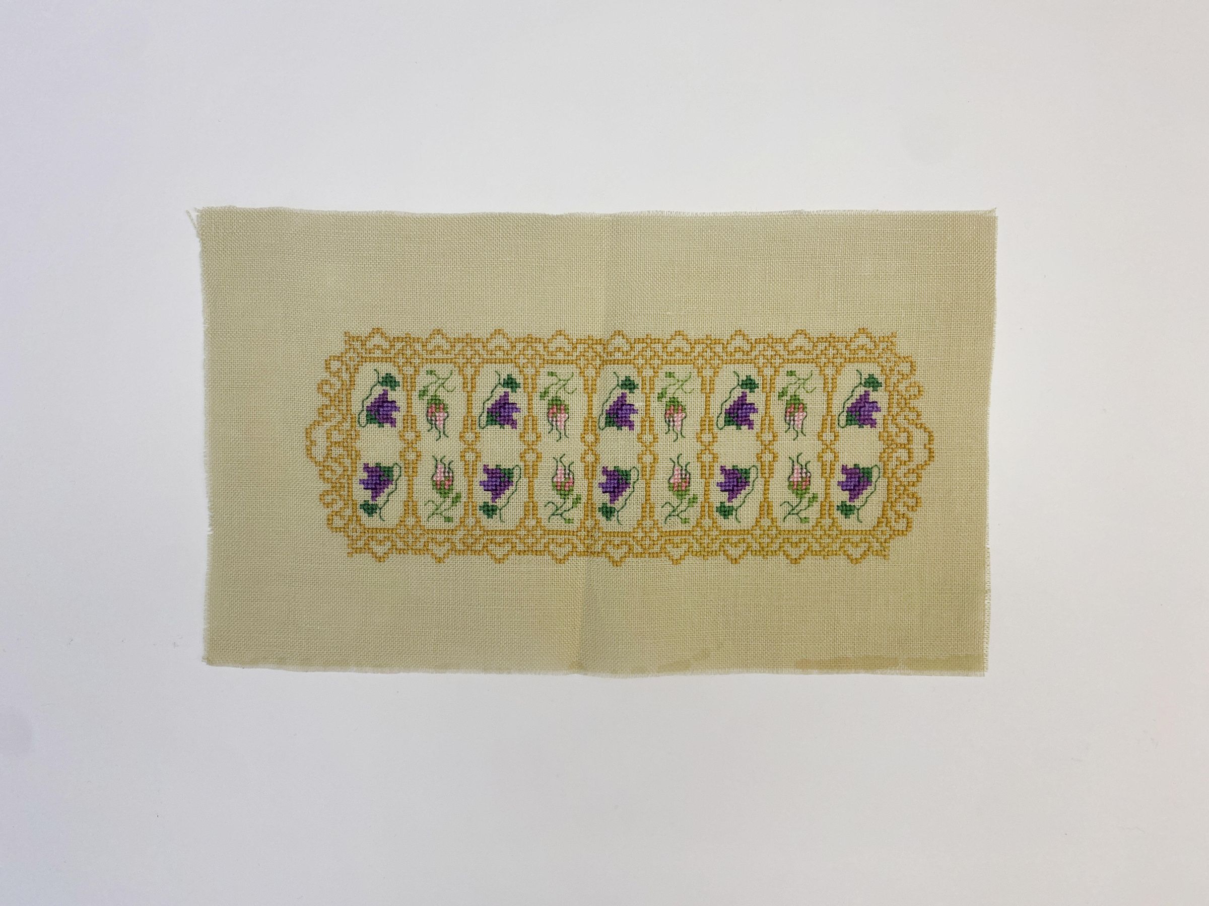 Cotton on maize colored linen. A Victorian inspired design in counted thread with deep yellow lattice enclosing pink rosebuds and violet roses. Adapted from a design by Linda Jary, titled, Victorian Border.Collection