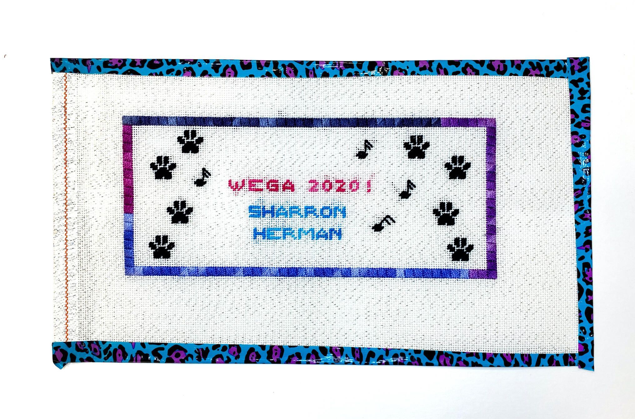 White linen thread with cotton and darned metallic embroidery threads. Musical notes and pet paws surround the inscription: WEGA 2020/Sharon HermanCollection