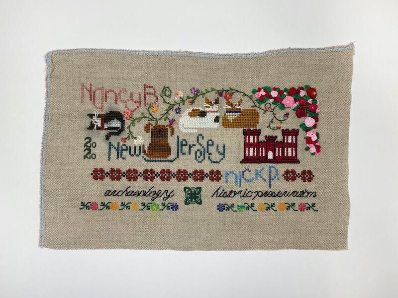 Cross stitched on natural linen with overdyed floss and silk ribbon. Three cats, a dog, vines, floral borders and a Celtic knot. Inscribed: Nancy B./2020/ New Jersey/Nick P. Archaeology/historic preservation.Collection