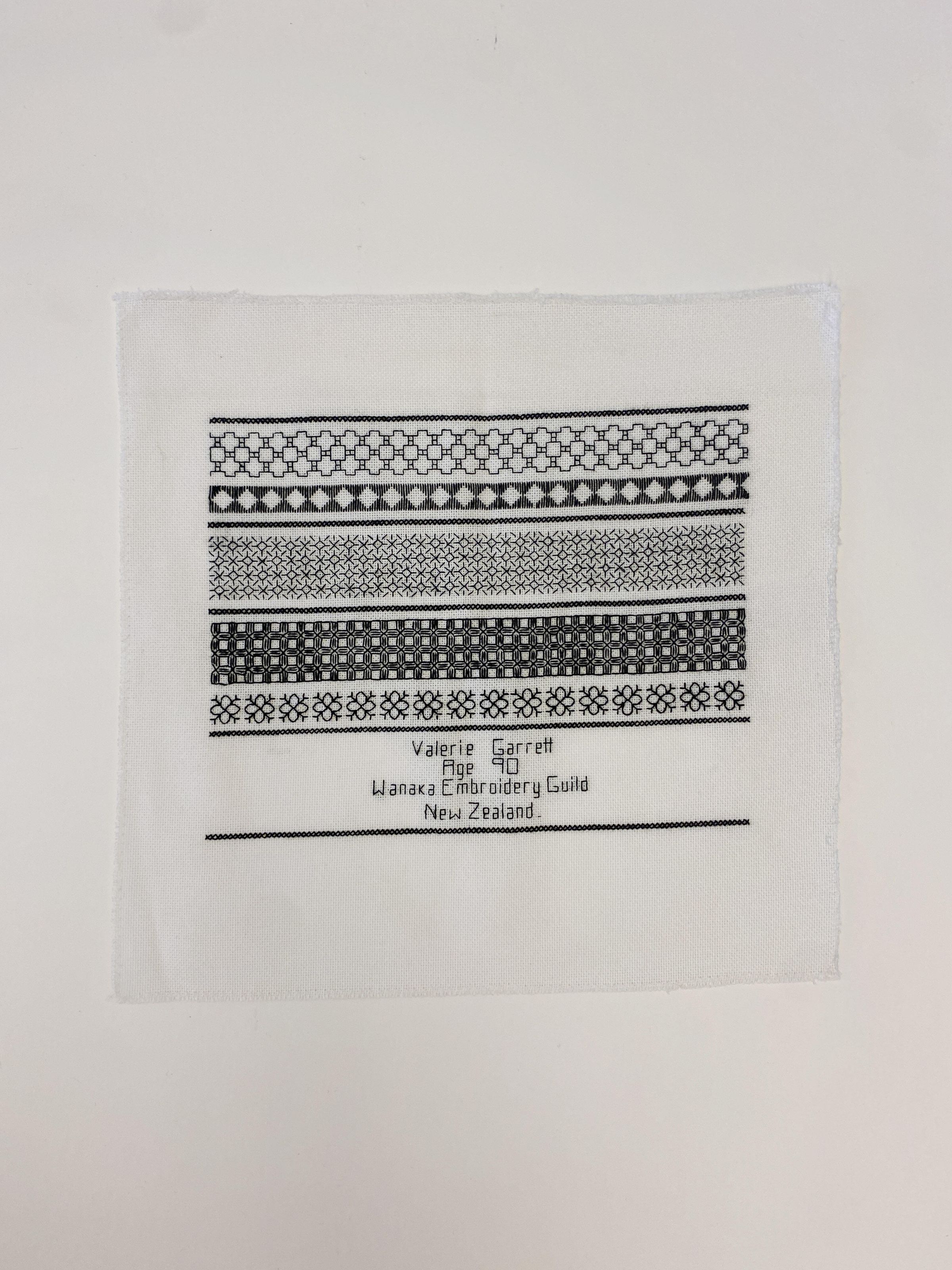 Blackwork patterns on cream linen. Inscribed: Valerie Garrett;Age 90/Wanaka Embroidery Guild/New ZealandCollection