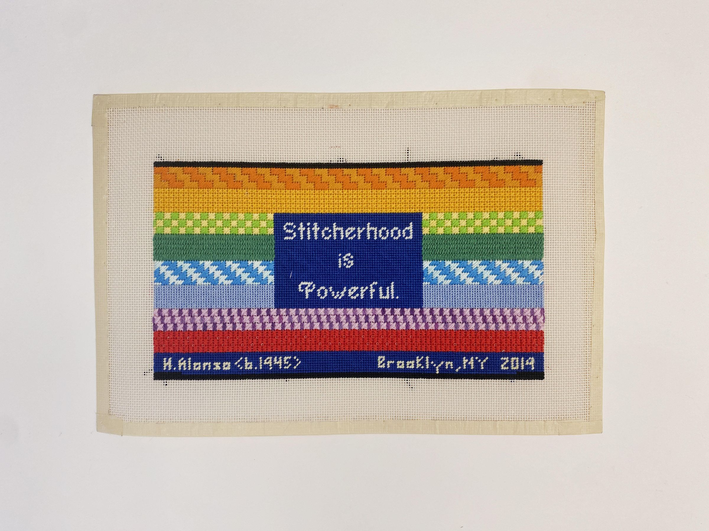 18 mesh mono canvas in eggshell. Stitches used: Byzantine, Mosaic, Scotch, Interlocking Gobelin, Milanese, Kalem, Roman Cross, Reversed Cashmere, in multi-color horizontal bands with a blue rectangle in the center for the stitched phrase: Stitcherhood is Powerful. Inscribed in a blue band at the bottom as H. Alonso [b. 1945] Brooklyn, NY 2019Collection