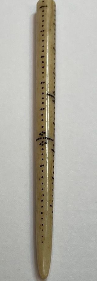 A long and tapered bone instrument with madras work dots going down the sides along with some longer horizontal markings for measuringContext