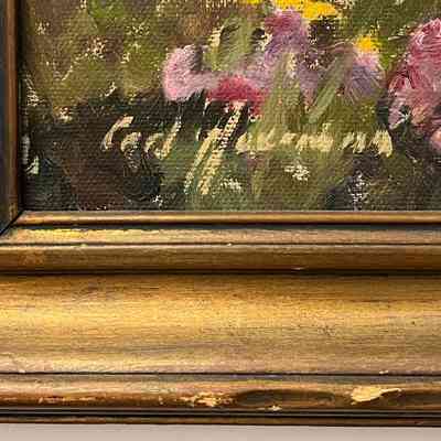 Landscape with wildflowers on a mesa and gray-blue mountains in the distance. Framed with 2.5 inch brown frame with two brass plaques.Type of Painting