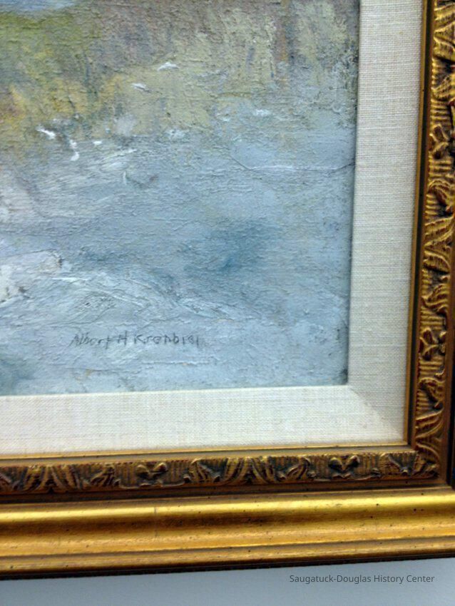 Notes: The finish on this painting is almost like plaster. There are no brush strokes, but rather, the finish is "built up" with layers of paint or gesso. This gives the artist the ability to "scratch" into the finish and to "wash out" the colors. In this case the technique is used to create the illusion of grey Winter air. Krehbiel, one of Chicago's best-known artists, spent many winters in Saugatuck.