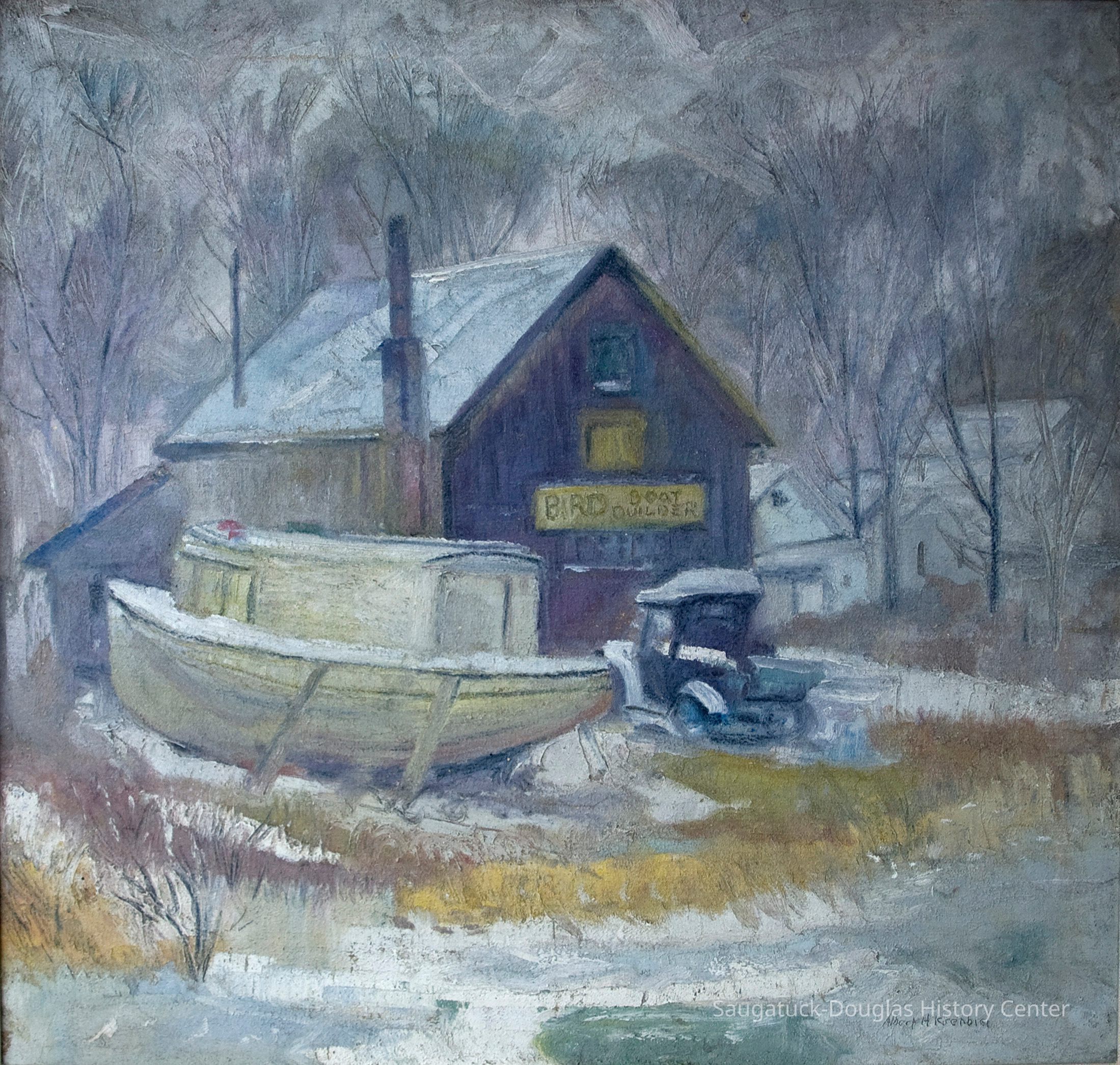 A wintertime painting of Carl Bird boat shop which was a recent gift to the permanent collection of the museum was just one of many that Chicago-area painter Albert H. Krehbiel did of Saugatuck snow and winter scenes. As recorded in this 1938 letter to his son, Evans, Krehbiel truly enjoyed the solitude and muted colors of winter. As the letterhead would indicate Krehbiel made the Maplewood his winter headquarters. He first visited Saugatuck in 1900 and taught at OxBow from 1926 to 1931 when he opened the AK Studio, just north of the Tourist Home hotel (now the site of Ship 'n Shore).Note