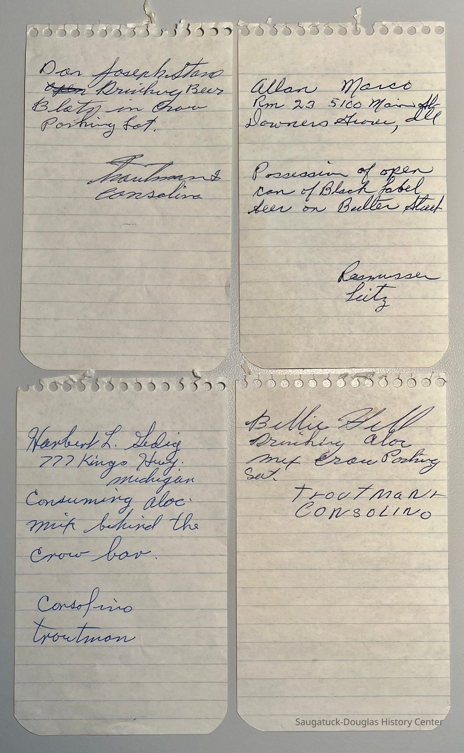 B. Fourteen pages from police officer's notebooks outlining the details of petty offenses, mostly alcohol possession. Notes include the name, address, date of birth of the offender and sometimes the time, place and details of the offense and name of police officers.