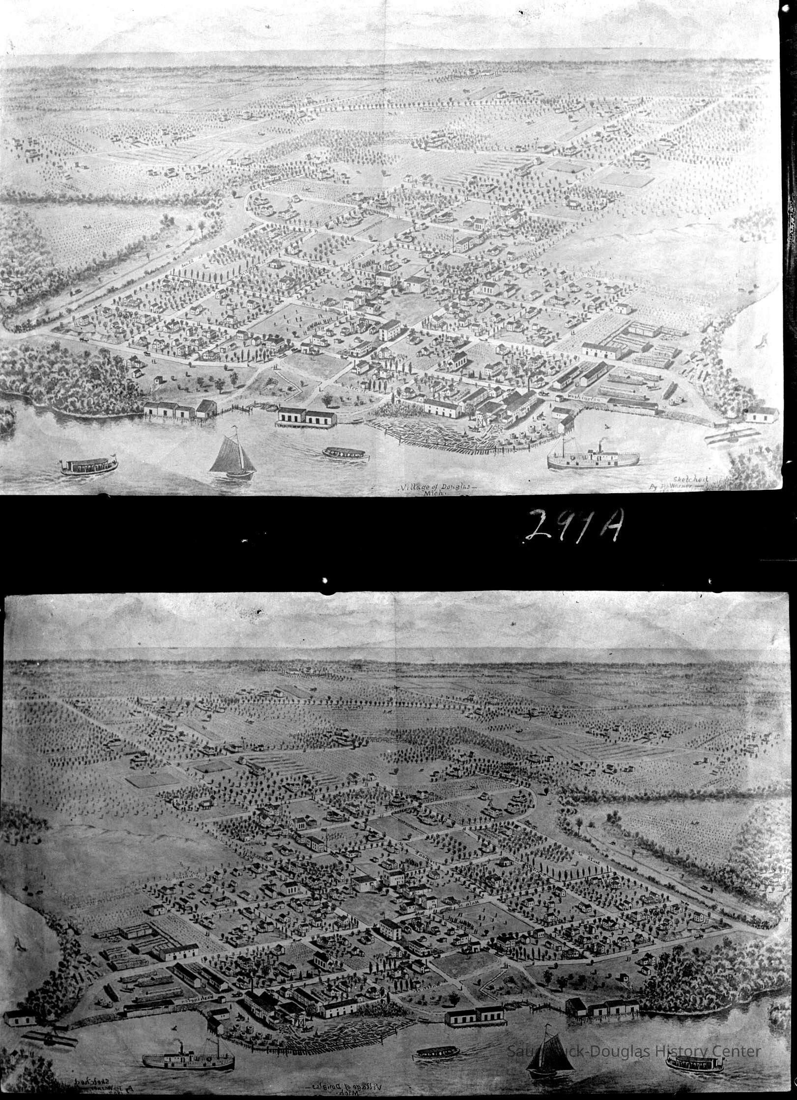 Photographic copy of Joseph Warner's aerial view drawing of Douglas