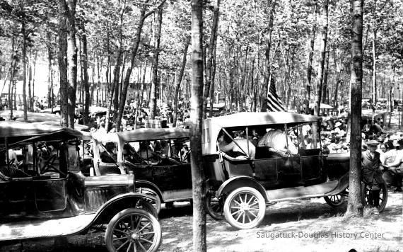 Model T type cars and crowds of people among the dappled shade of trees. A structure is visible in the background.
