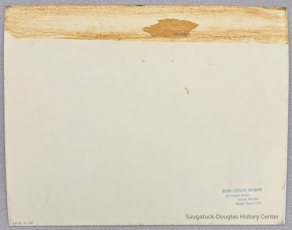 The photo is pasted to an illustration board and on the back has a stamp that reads "Holland Illustrative Photography, 535 Douglas Avenue, Holland, Michigan, Phone: EXport 4-4972."Photograph Details