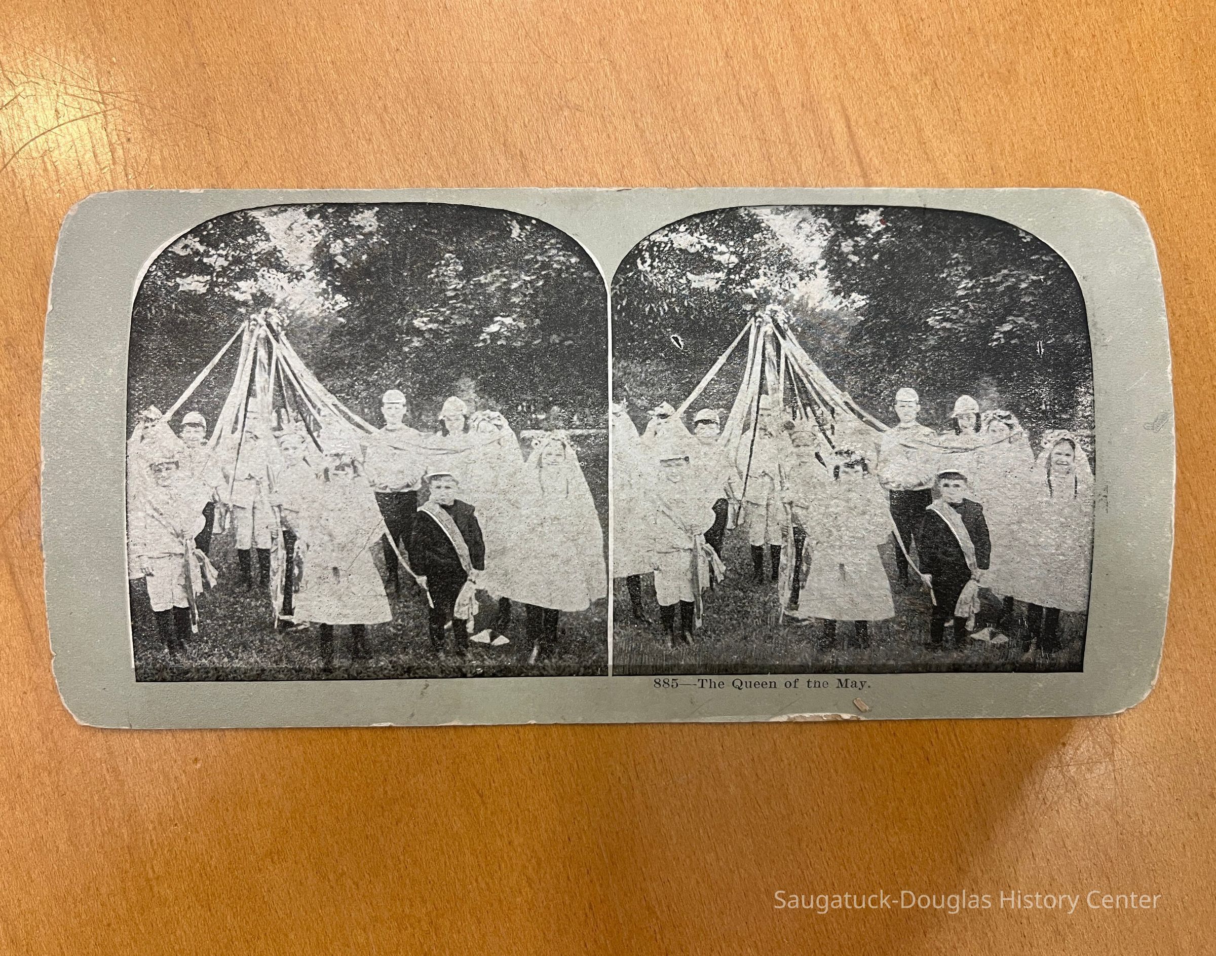 Three young children with sleigh in the snow on the reverse side is a view of children by a May pole titled: The Queen of the MayCollection