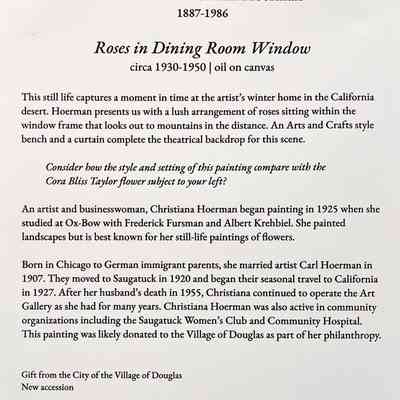 Still life painting of a golden glass vase full of red-pink, white and yellow roses. The arrangement is placed on a table top with a blue-gray bench and window in the background. The gray and tan mountains in the distance suggest a Coachella Valley location.