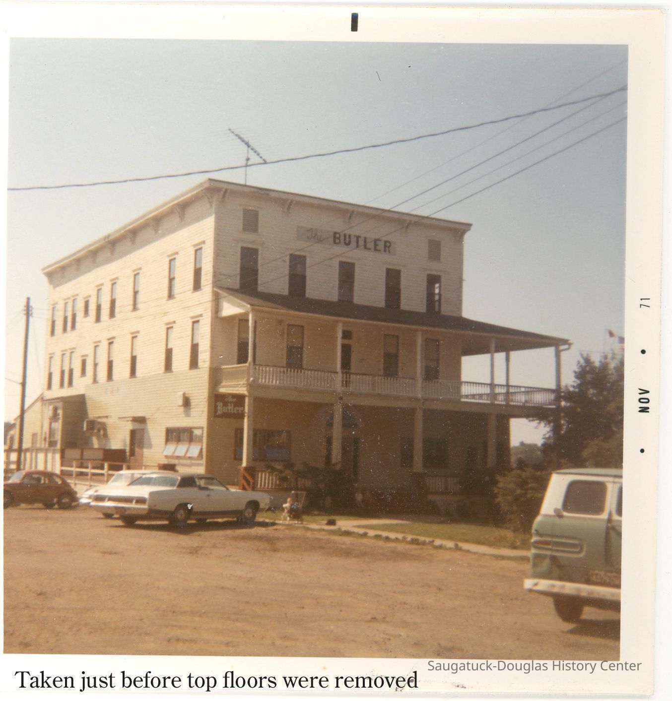 What's the first thing you do when you plan to tear the top two floors off a hotel? You build a new roof over the remaining floor. That's what they did at the Butler Hotel in Saugatuck, so that business can continue, rain or shine, while workmen dismantle things above. This view, looking northwest from the second floor, shows how it's done. The owners of the Butler, Robert N. Sergeant, Lowell Livingstone and Verser White, decided last year to remove the attic and top two floors, largely unused these days as a hotel, because of their age and a lack of heat. The remaining portion houses the restaurant and bar on the first floor and the rooms of the Singapore Yacht Club in the basement. The building, constructed in 1882, started out as a grist mill. It was enlarged and turned into a hotel in 1901 by Capt. and Mrs. W.G. Phelps. In 1922 the building was sold to Mr. and Mrs. Charles Redebaugh. A hotel poster from the Redebaugh era is one of the few artifacts found during the demolition.