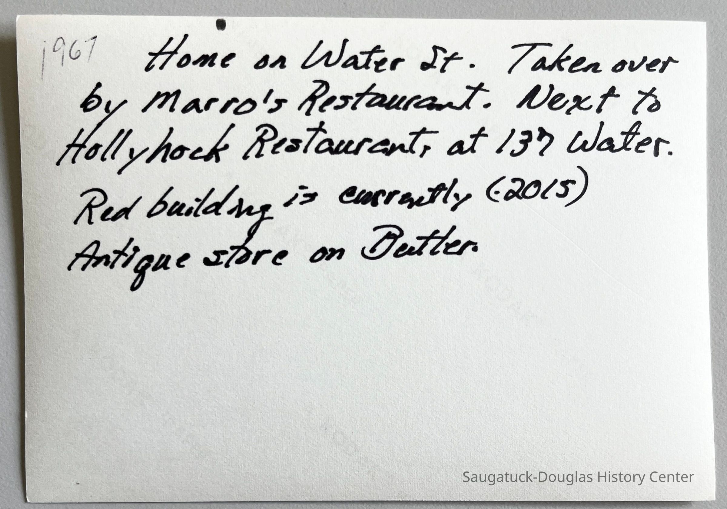 A note on the back reads "1967 Home on Water St. Taken over by Marro's Restaurant. Next to Hollyhock Restaurant at 137 Water. Red building is currently (2015) Antique store on Butler."Photograph Details