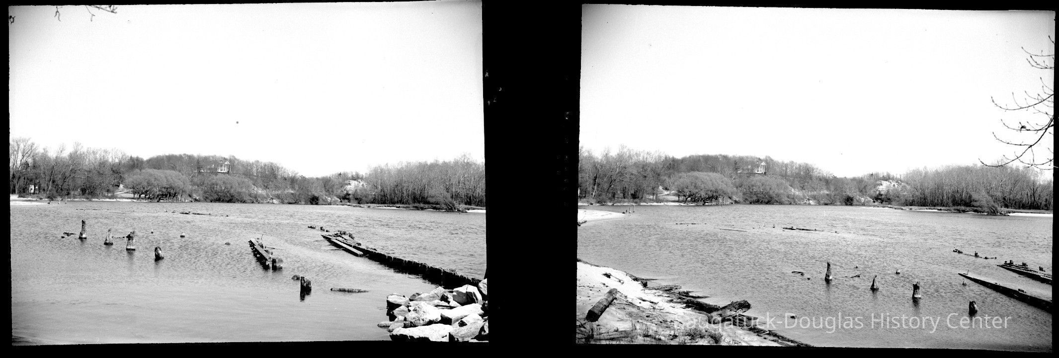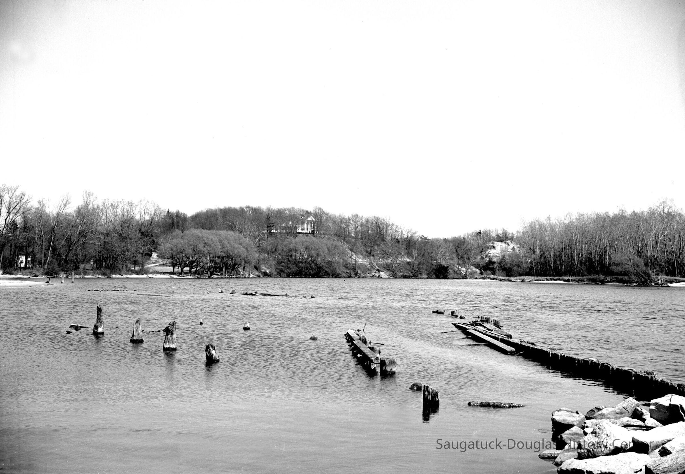 Traces of Singapore's wooden pilings in the water with Cook/Bennett mansion on a hill in the distance.