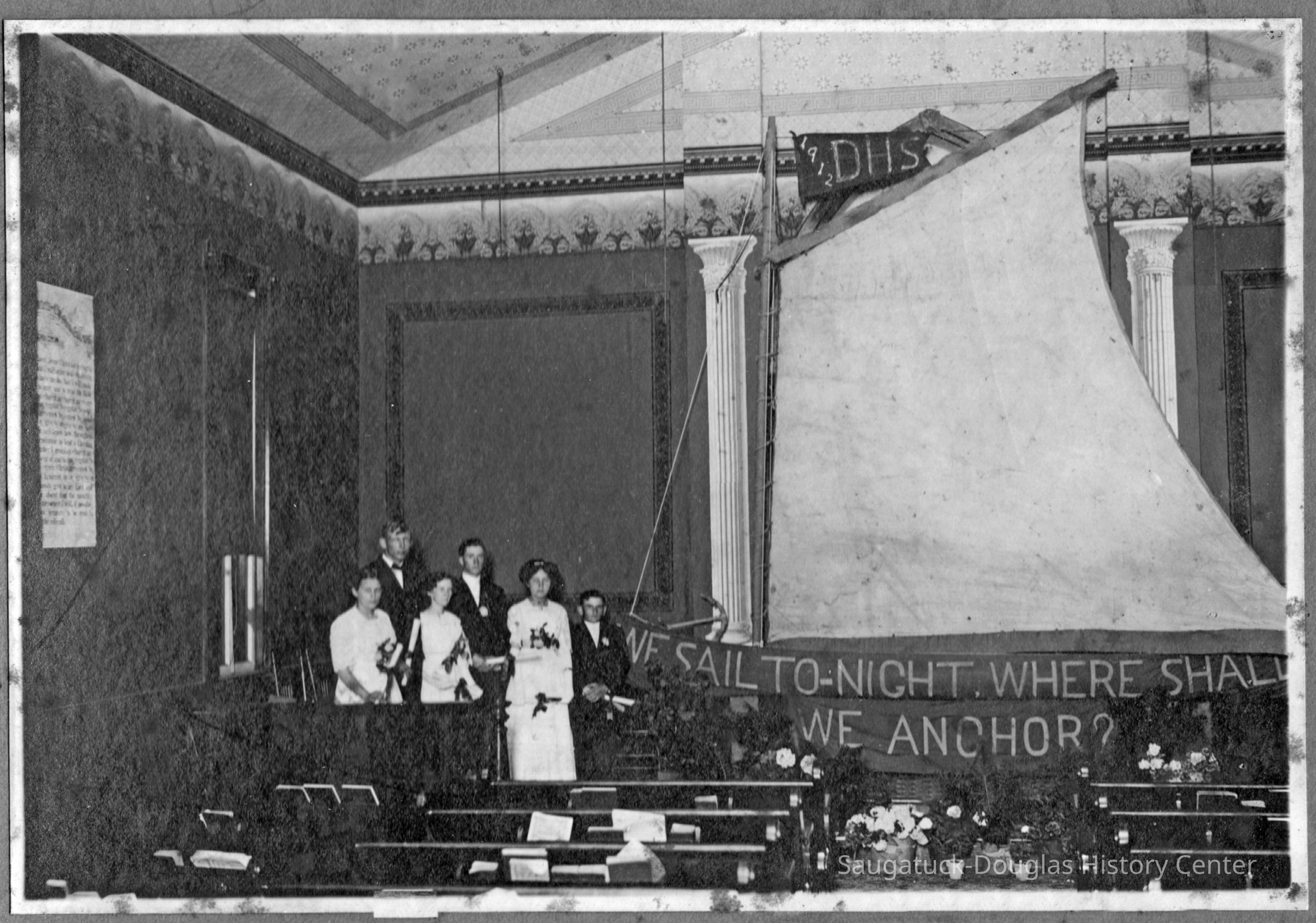 Six student of the graduating class of 1912 DHS (unknown) at the front of a church or auditorium next to a sailboat with a banner reading "We Sail To-Night, Where Shall We Anchor?"Photograph Details