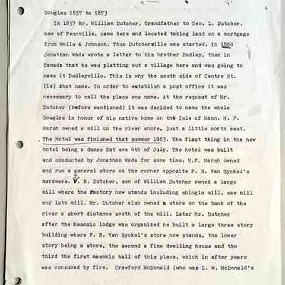 In 1857 Mr. William Dutcher, Grandfather to Geo. L. Dutcher, now of Fennville, came here and located taking land on a mortgage from Wells & Johnson. Thus Dutcherville was started. In 1860 Jonathan Wade wrote a letter to his brother Dudley, then in Canada that he was platting out a village here and was going to name it Dudleyville. This is why the south side of Centre St. (is) that name. In order to establish a post office it was necessary to call the place one name. At the request of Mr. Dutcher (before mentioned) it was decided to name the whole Douglas in honor of his native home on the Isle of Mann. H. F. Marsh owned a mill on the river shore, just a little north east. The Hotel was finished that summer 1863. The fisst thing in the new hotel being a dance Sat eve 4th of July. The hotel was built and conducted by Jonathan Wade for some time. H.F. Marsh owned and run a general store on the corner opposite F. B. Van Syckel's hardware. V. B. Dutcher, son of William Dutcher owned a large mill where the factory now stands including shingle mill, saw mill and lath mill. Mr. Dutcher also owned a store on the bank of the river a short distance south of the mill. Later Mr. Dutcher after the Masonic lodge was organized he built a large three story building where F. B. Van Syckel's store now stands, the lower story being a store, the second a fine dwelling house and the third the first masonic hall of this place, which in after years was consumed by fire. Crawford McDonald (who was L. W. McDonald's