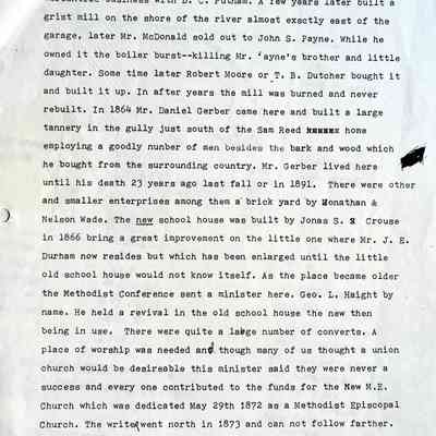 Nelson Wade. The new school house was built by Jonas S. Crouse in 1866 bring a great improvement on the little one where Mr. J. E. Durham now resides but which has been enlarged until the little old school house would not know itself. As the place became older the Methodist Conference sent a minister here. Geo. L. Haight by name. He held a revival in the old school house the new then being in use. There were quite a large number of converts. A place of worship was needed and though many of us thought a union church would be desirable this minister said they were never a success and every one contributed to the funds for the New M.E. Church which was dedicated May 29th 1872 as a Methodist Episcopal Church. The writer went north in 1873 and can not follow farther.