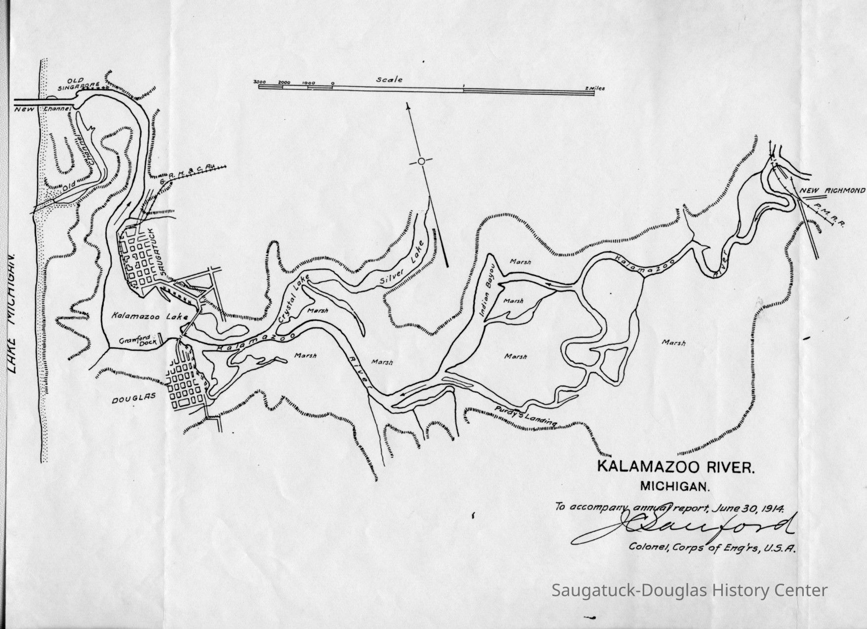 Landmarks visible but unlabeled include the H.B. Moore docks on the southeast edge of Douglas and the boom into Lake Kalamazoo from Saugatuck.Context