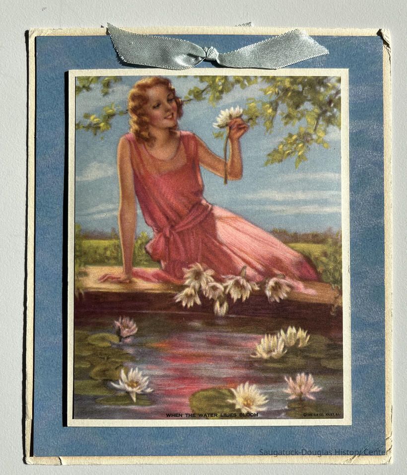 Greeting-card size 1932 calendar with "When the Water Lilies Bloom" image of a young woman in pink dress gathering the flowers on the cover. Image copyrighted by the G-B Co., Joliet, Illinois. Image is attached to blue backer mat adorned with a pale blue ribbon for handing the calendar. Calendar appears to be unused.