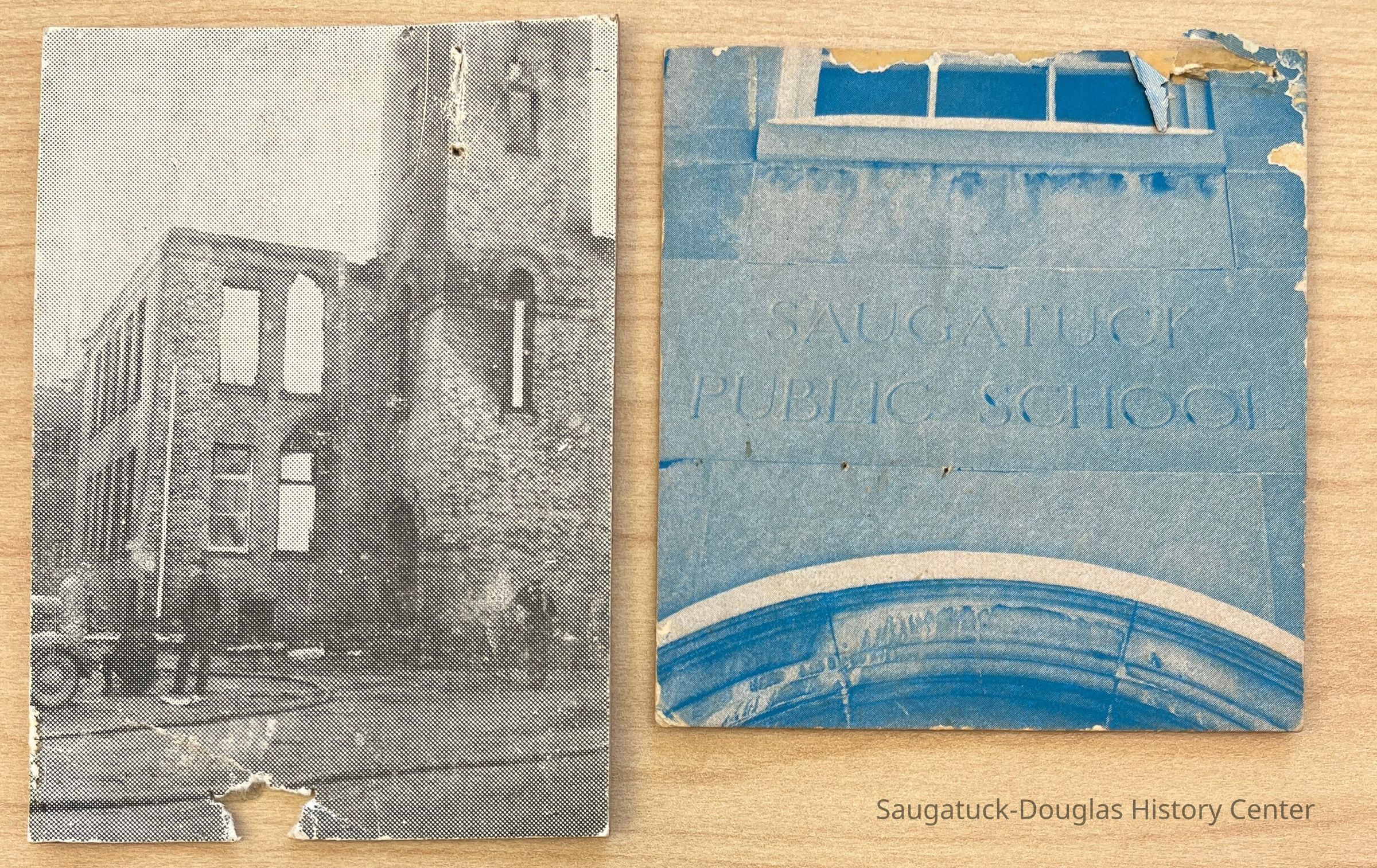 Three images of the 1897 portion of the Saugatuck School after the 1950 fire. The three images were cut from a publication that was printed on heavy cardstock.Photograph Details