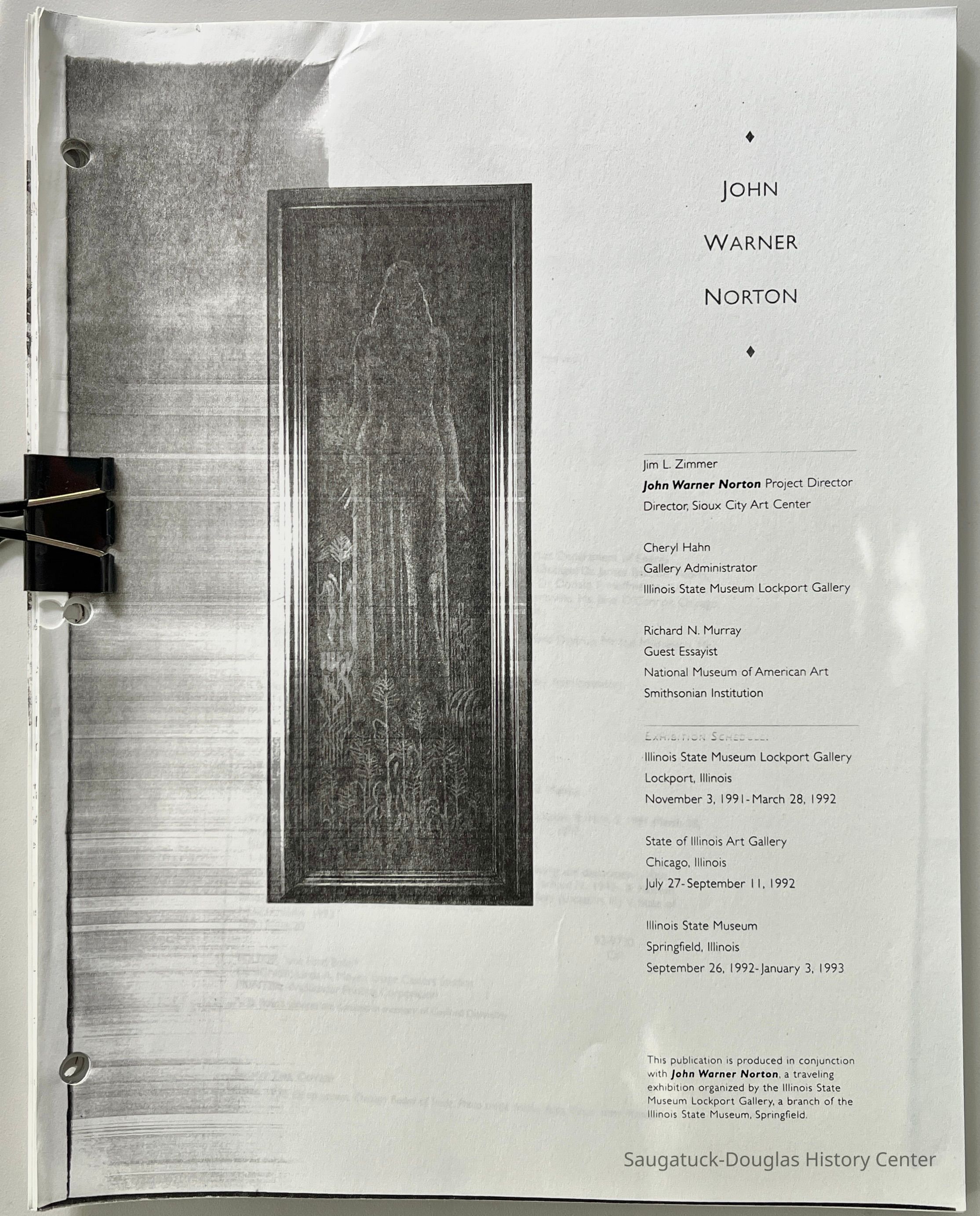 Jim L. Zimmer John Warner Norton Project Director Director, Sioux City Art Center Cheryl Hahn Gallery Administrator Illinois State Museum Lockport Gallery Richard N. Murray Guest Essayist National Museum of American Art Smithsonian Institution Illinois State Museum Lockport Gallery Lockport, Illinois November 3, 1991-March 28, 1992 State of Illinois Art Gallery Chicago, Illinois July 27- September 11, 1992 Illinois State Museum Springfield, Illinois September 26, 1992- January 3, 1993 This publication is produced in conjunction with John Warner Norton, a traveling exhibition organized by the Illinois State Museum Lockport Gallery, a branch of the Illinois State Museum, Springfield.