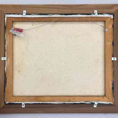 Landscape painting of two fishing boats with tall outrigger booms moored at a dock with a white building along the left side of the composition. A palm tree on the right side of the painting suggests a tropical or sub tropical location.