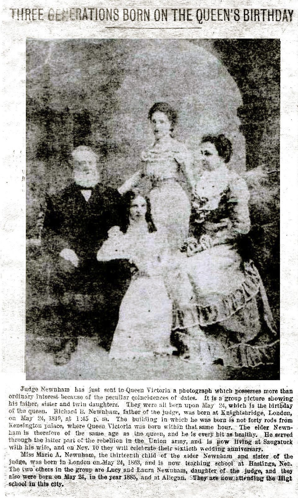 My Great Grandmother Charlotte Hannah did not see her parents again but letters passed between her sister Mary Ann's daughter Rose and Richard's grandson Stephen Linney Newnham. Also a copy of the newspaper cutting was among Mary Ann's effects reporting on Richard's letter from America to Queen Victoria with a photograph of himself, his daughter Maria and two grandchildren Laura and Lucy to tell her that he was born within an hour of her birth on 24th May 1819, and that his daughter and twin grandchildren were also born on the same day. This cannot be coincidence! American descendants have recorded that the royal household returned a photograph of four members of the royal family--of different generations--including the Queen herself, the Prince of Wales, the Duke of York, and the infant son of the last named.