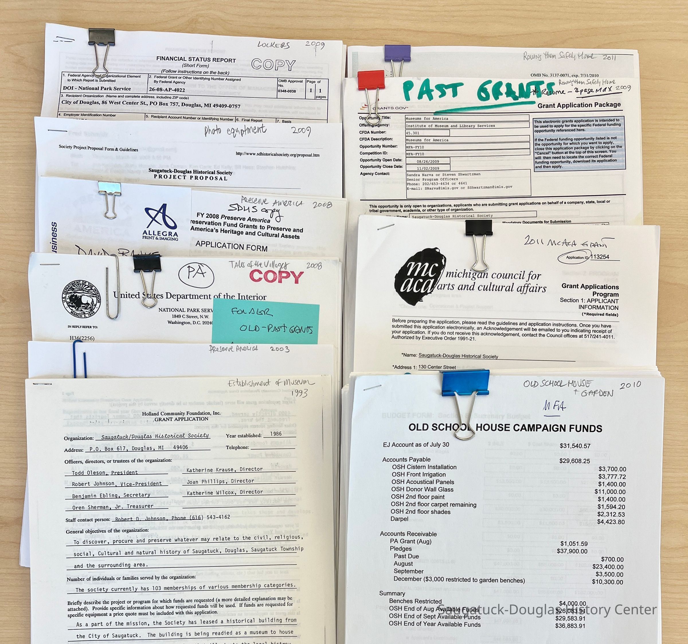 Paperwork generated by various members of the SDHC to apply for grants from Michigan Council for Arts and Cultural Affairs (MCACA), the Roland Foundation, Museums for America, Institute of Museum and Library Science, United States Department of the Interior, Preserve America, National Park Service and other funding organizations from 1993 to present.