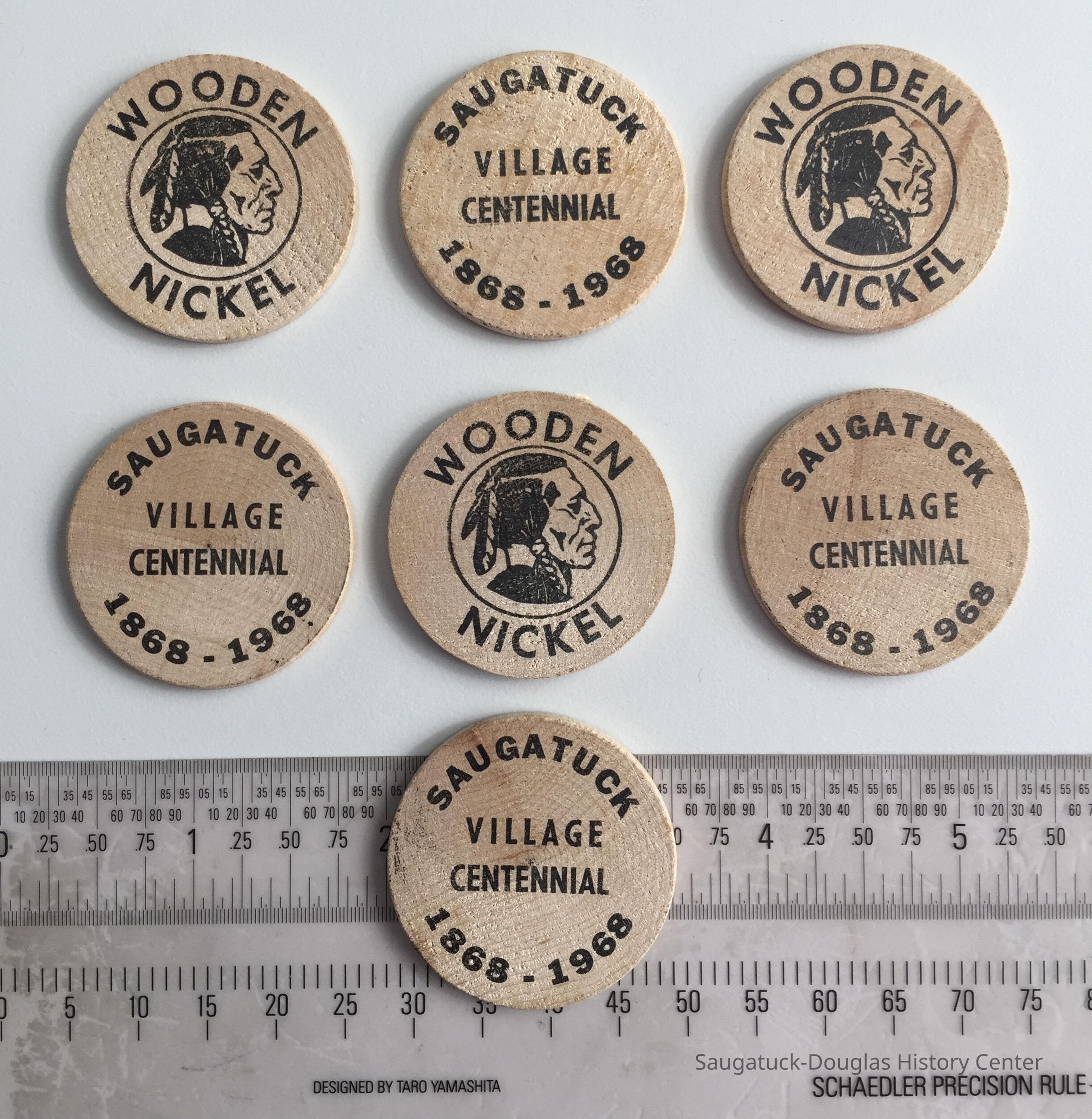 Seven wooden nickel commemorating the 1968 Saugatuck Village Centennial.