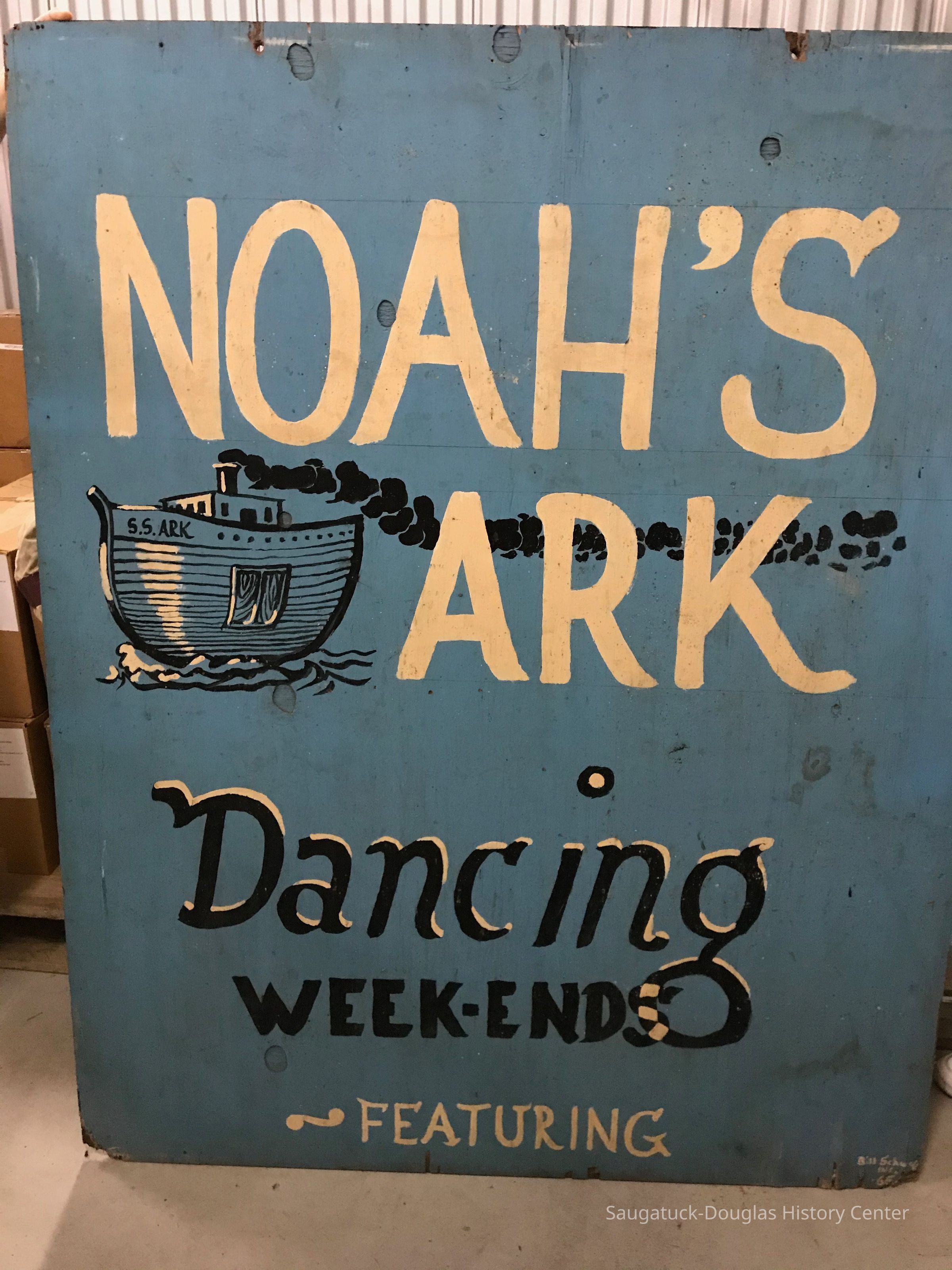 Wood sign on plywood with the words "Noah's Ark" located on Water Street in Saugatuck. Bar/Club for teens in the 1960s. Hand painted sign with signature in lower right "Bill Schwartz" with additional illegible marks. Teal-blue background with yellow and black text and images.Collection