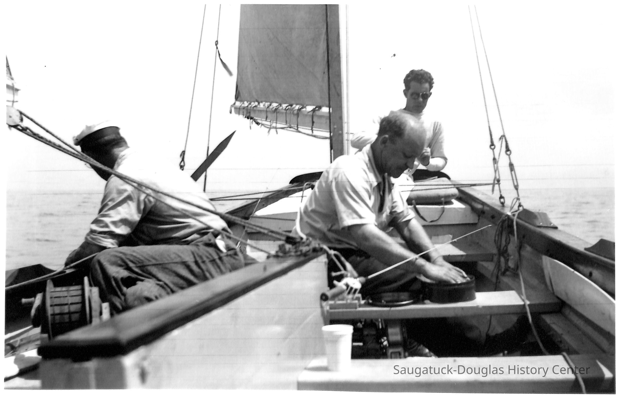 Photo of George M. Worthington, Carl Bird, and Abbot Davis aboard the Francis Lifeboat,1939.