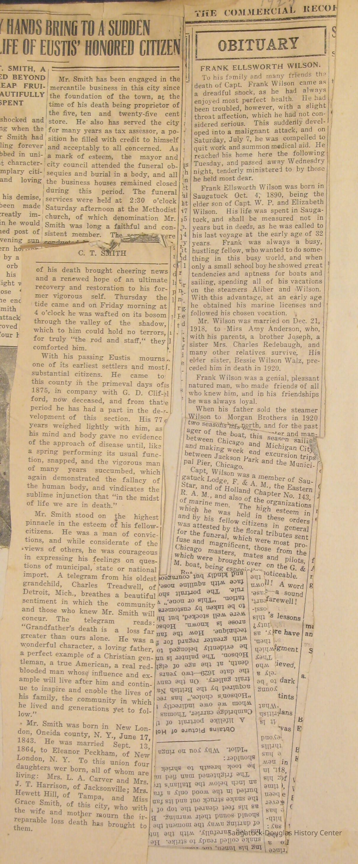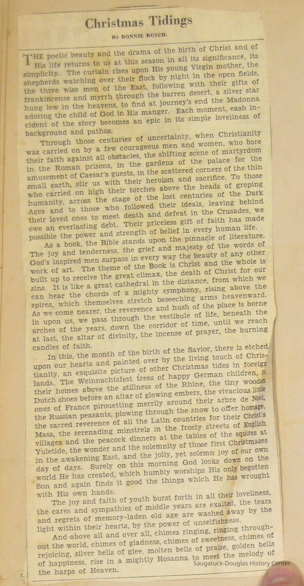 Plus notices about Woman's Club, Kaffee Klatch, Shorewood Association Injunction Case, Cooking Classes, a curious Air Mail party,a 1896 tornado, Bi-Centennial Party, performance by Peak Sisters, Meaning of the Poppy, Saugatuck Art Association, John Norton exhibit at Saugatuck Art Gallery, Frank Greenleaf leads Petoskey Pageant, Otto Foster and family participate in Indian powwow in Petoskey, Christmast tidings by Bonnie Busch, Congregational Church banquet, Powell Club, Womanless Wedding, Finch-Brown wedding, Henry T. Winchester and Prof. Herbert S. Mallory killed by train, and an editoiral against the use of tobacco by Mrs. M.E. Morrison.Collection