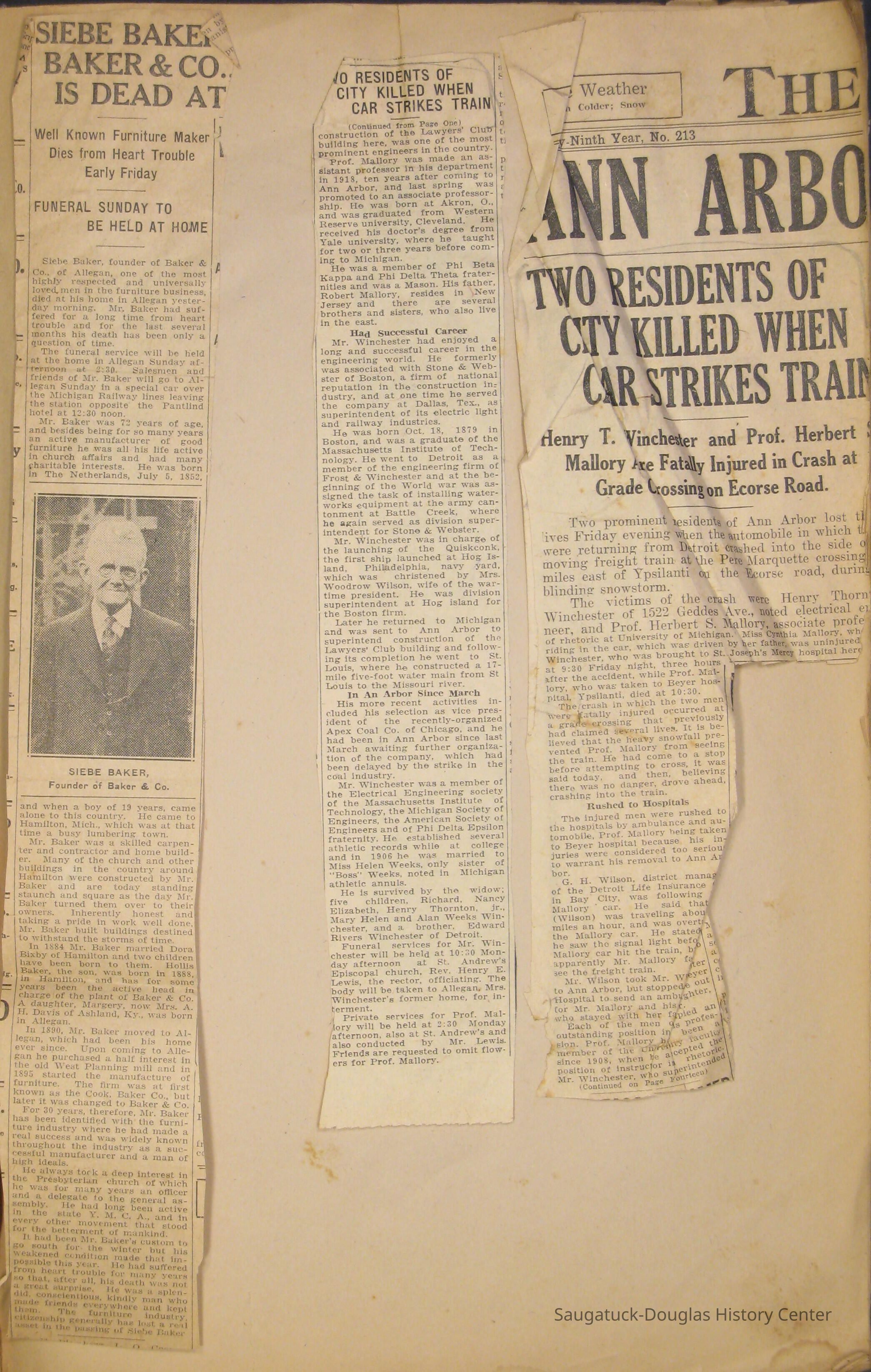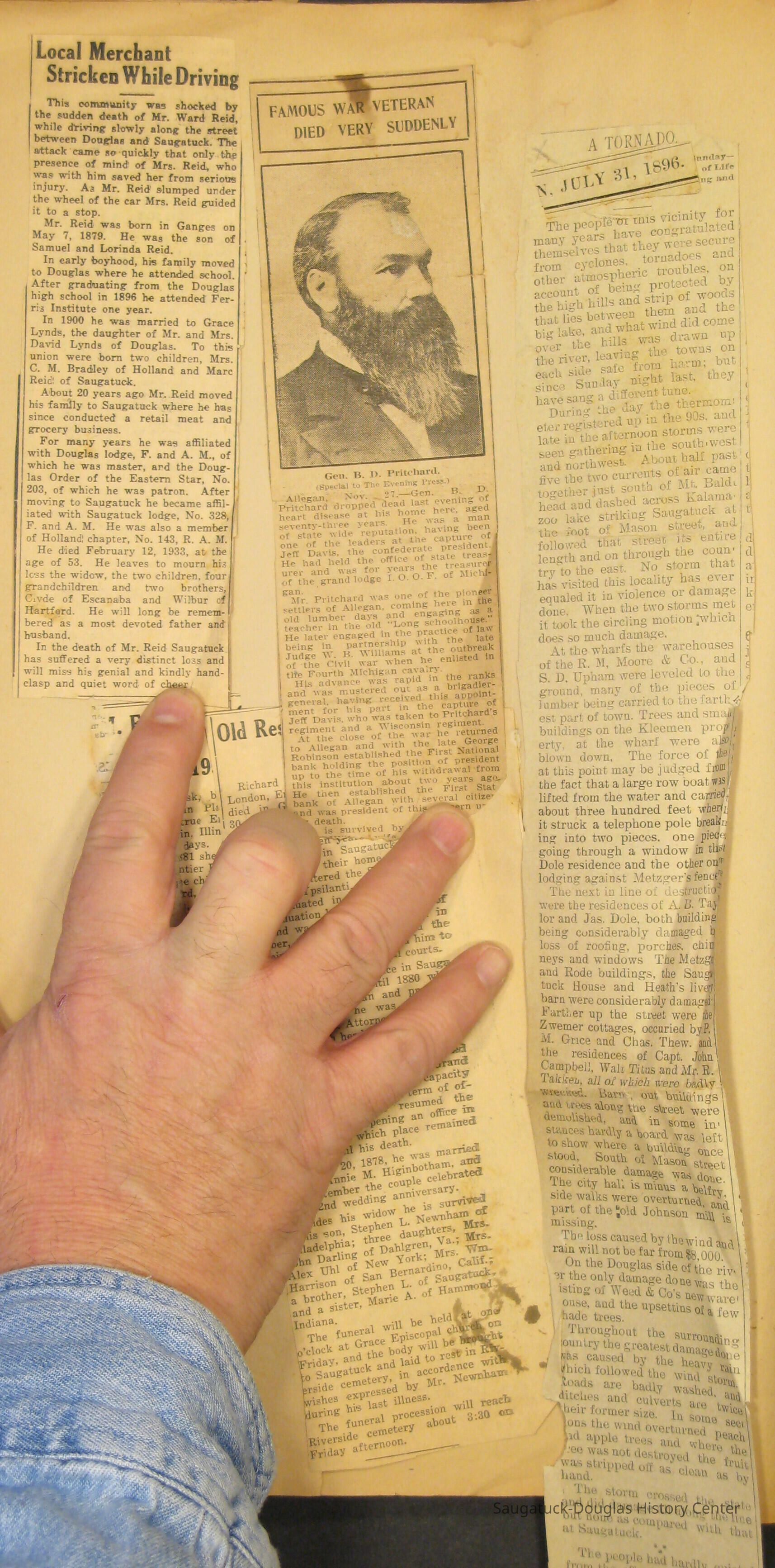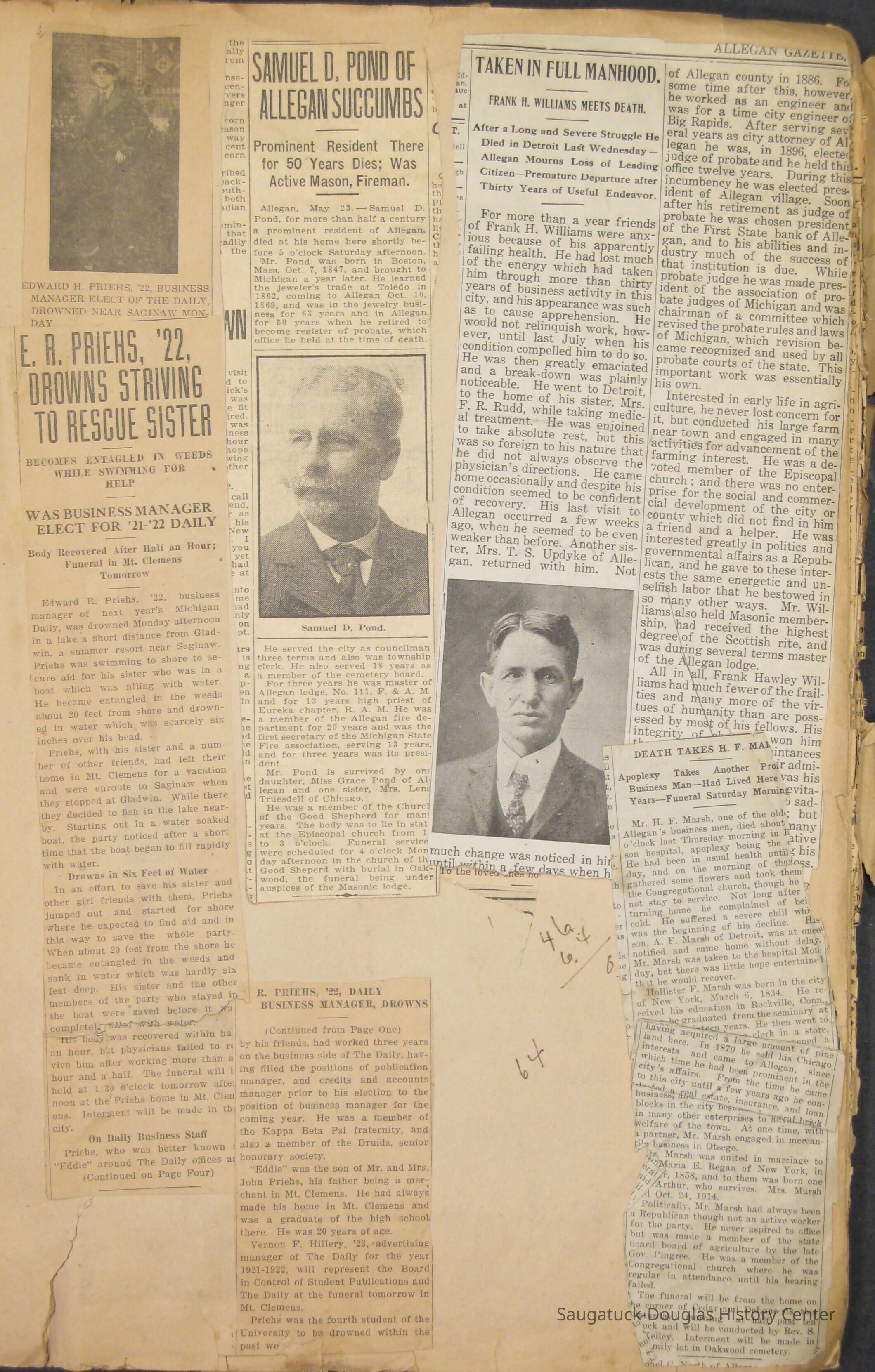 May Heath’s scrap book containing newspaper obituaries or articles about Saugatuck, Douglas and Allegan residents including