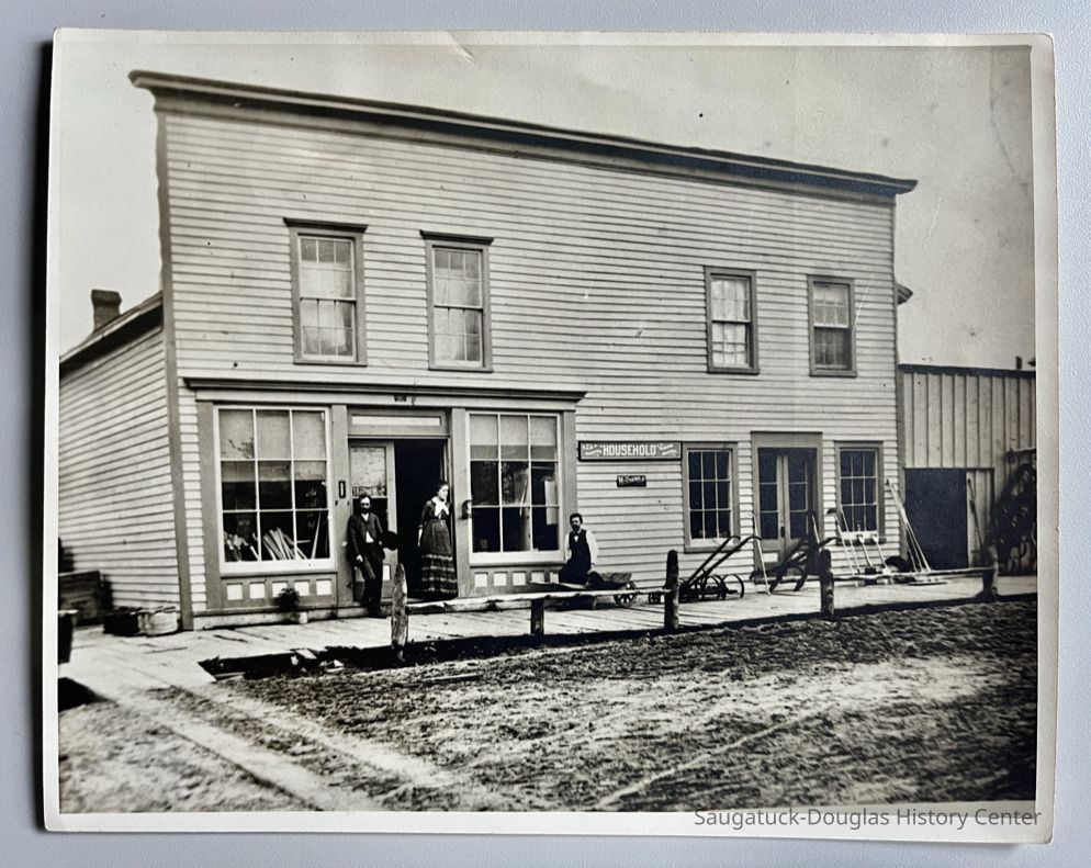 "Douglas never developed a great number of mercantile establishments on its principal business street-Center Street. It probably suffered to a certain extent because Saugatuck got an earlier start and the established businesses in that town continued to pre-empt the needs of its younger neighbor. However, throughout its history, it did support a number of general stores as well as several grocery stores, including an A & P Store. One of the earliest was that of D. C. Putnam which was situated on the southwest corner of Center Street. As was the practice in those earlier years, Putnam sold everything from horse collars to peppermint sticks including a large line of agricultural implements. In its heyday, the Putnam store hired a number of clerks and did a wide business especially with the farm trade. In 1902 the large wooden Putnam building caught fire from an overheated stove and was completely destroyed. By that time Putnam had passed to his reward after having been in business for almost forty years (1894) and the current owners were not disposed to rebuild. The corner stood vacant until recent years when the village erected a village office and fire department. This was the first substantial public building ever owned by the Village of Douglas. At one time Putnam's building, in addition to all of its other contents, housed the village fire apparatus which, following the fire, was kept for many years afterward in the lower rear portion of the village hall."