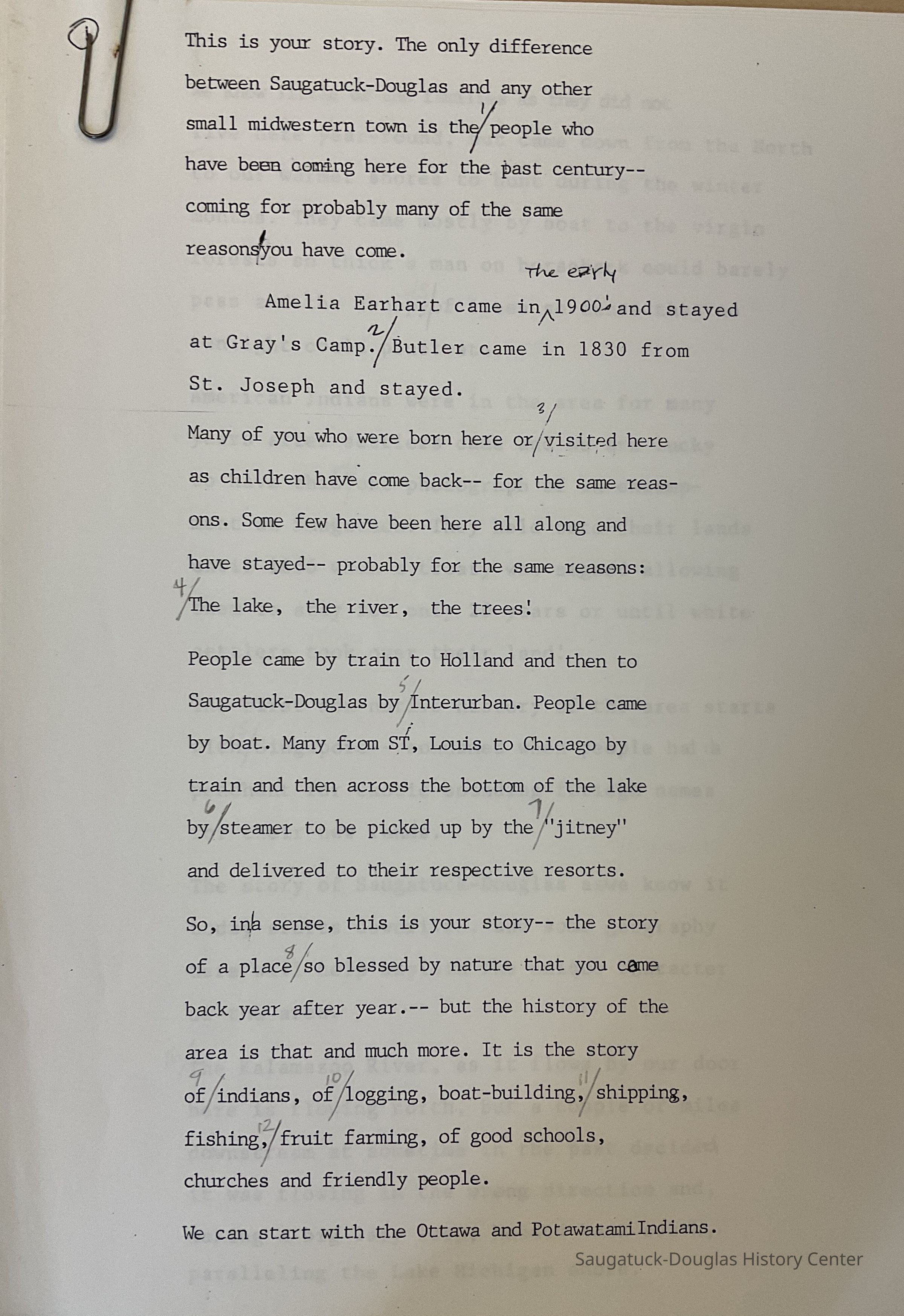 Brief history of Saugatuck and Douglas script used for promotion of the SDHS museum. - Un-editedCollection