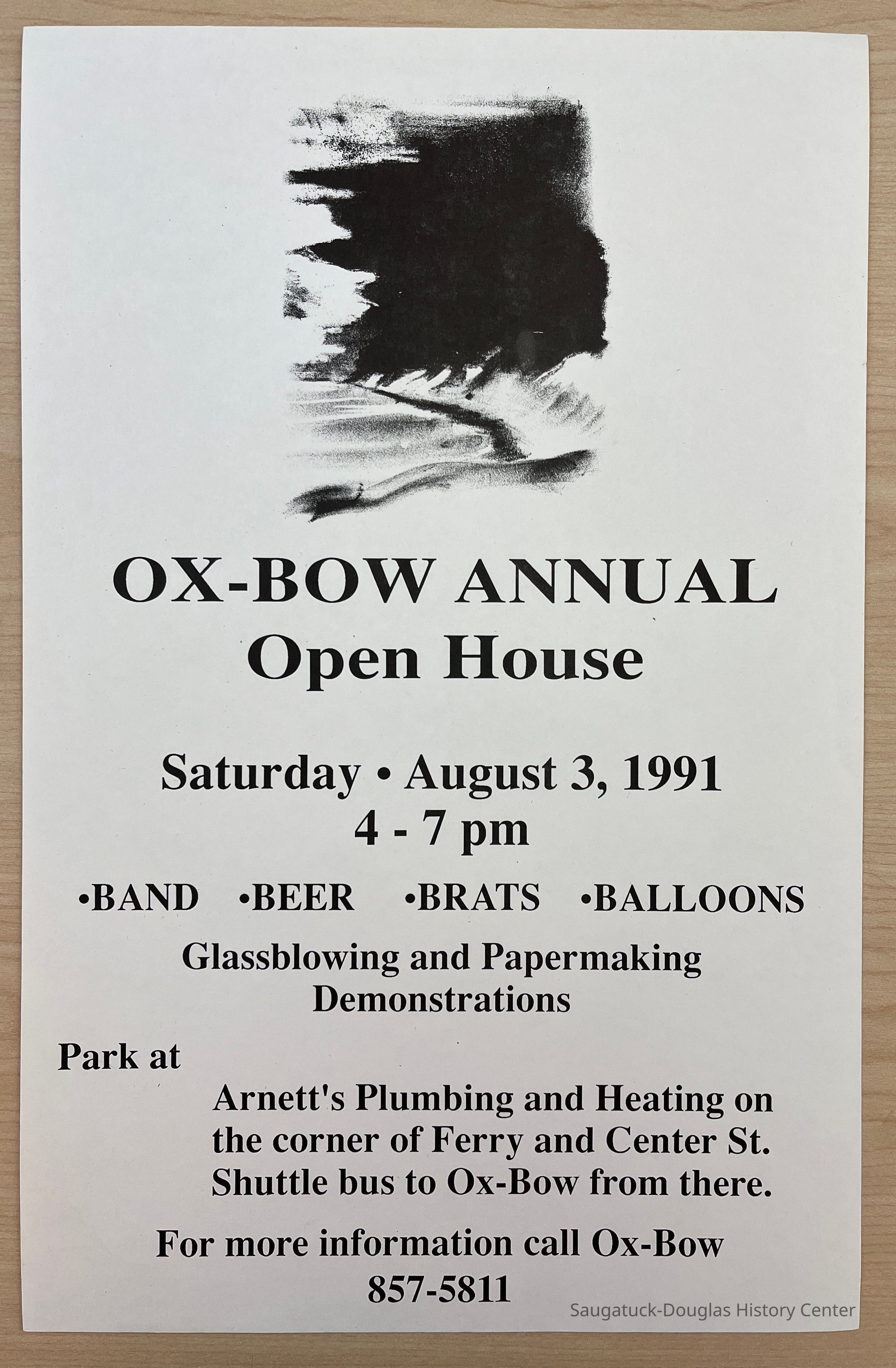 11" x 17" poster announcing the Ox Bow Annual Open House, Saturday, Aug. 3, 1991 4-7 p.m. Park at Arnett's Plumbing and Heating.