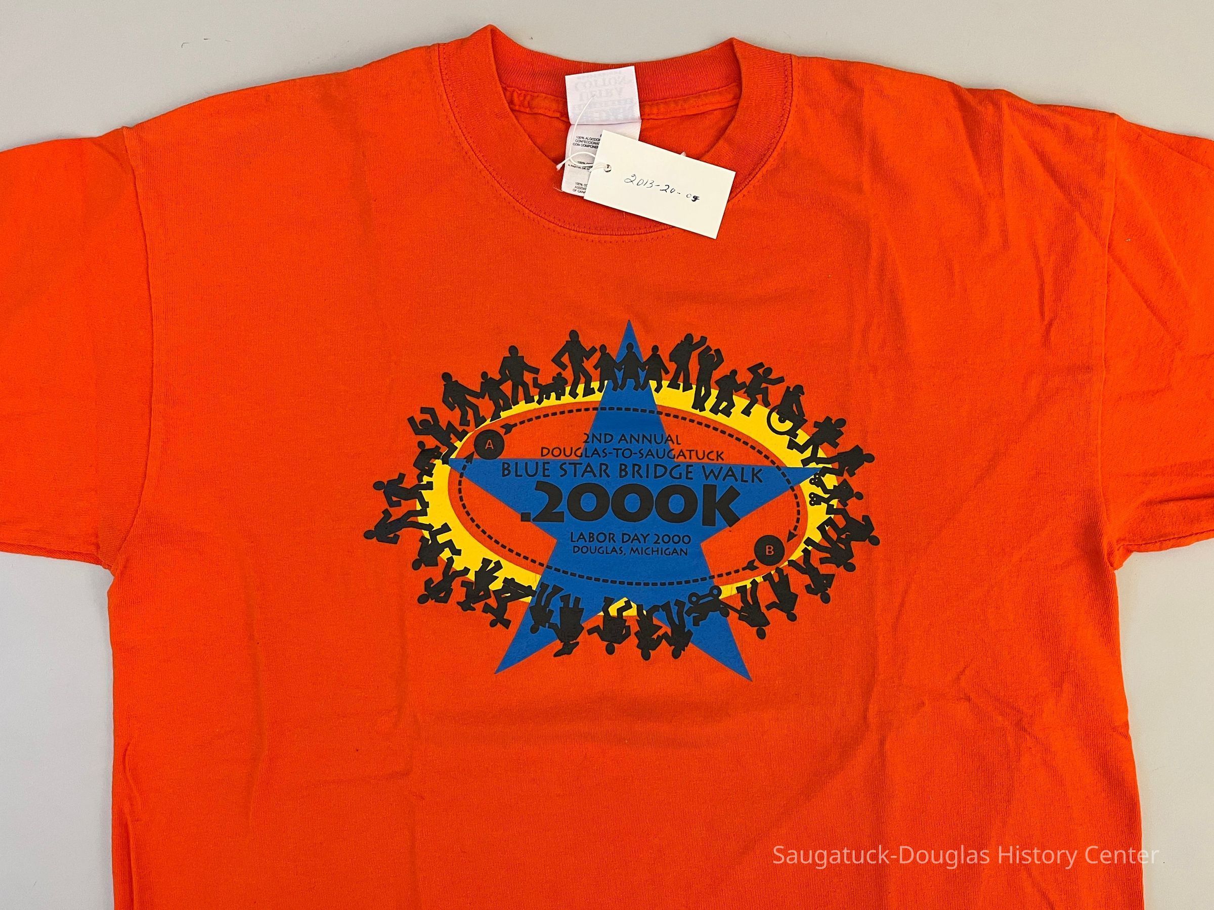 Orange T-shirt with the words, "2nd Annual Douglas to Saugatuck Blue Star Bridge Walk .2000K Labor Day 2000 Douglas, Michigan" in black lettersCollection