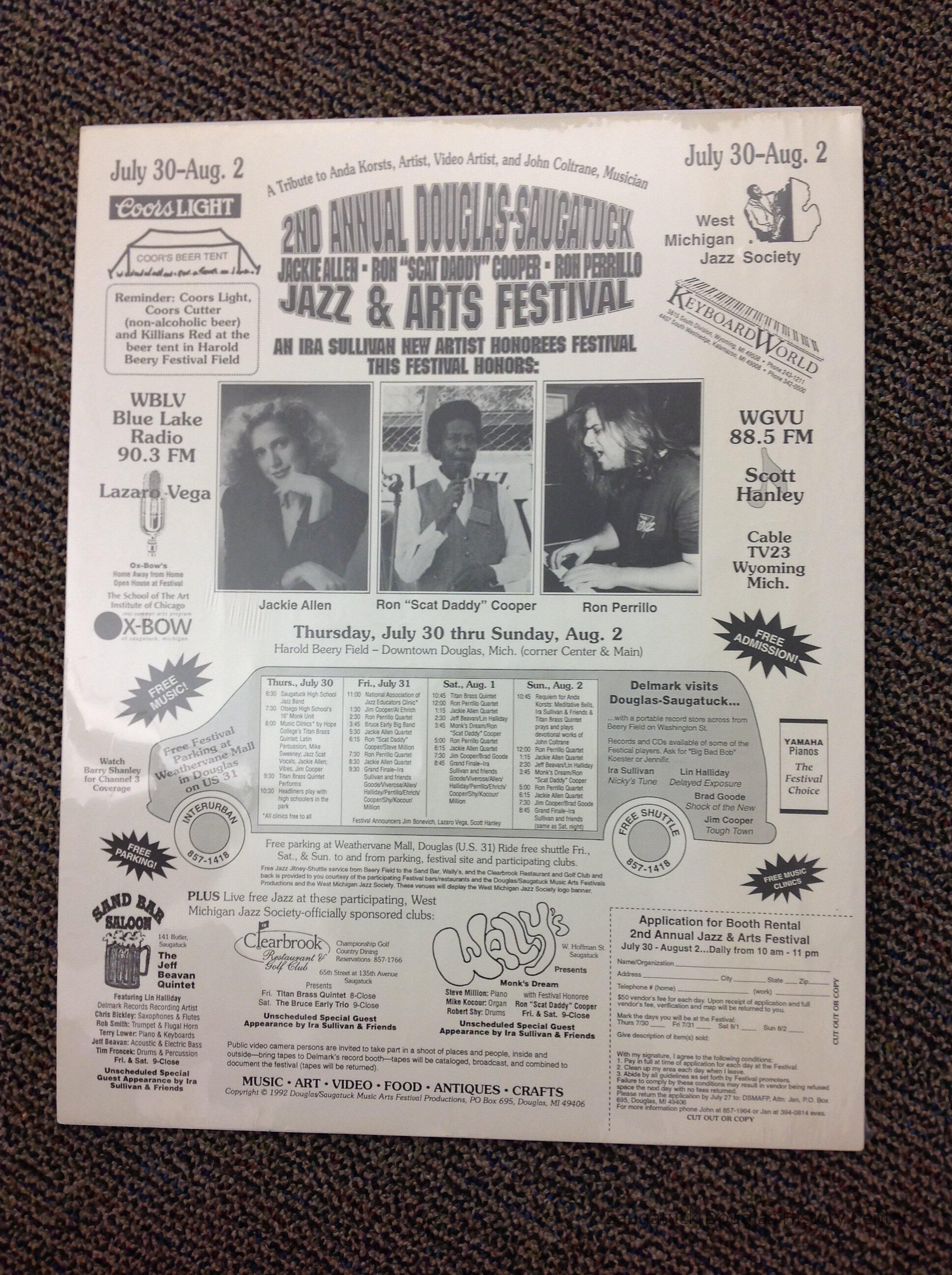 A paper poster advertising the Second Annual Douglas Saugatuck Jazz and Arts Festival including artists performing and a schedule of event. 17.5 w x23"h July 30 - August 2 1992Collection