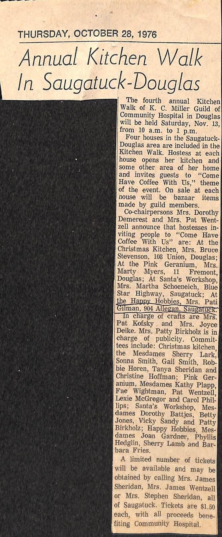 Collection of documents and photos related to the work of the K.C Miller Guild. They were a volunteer group that would do fundraising and put on events to support the Douglas Community Hospital. This collection contains two scrapbooks for the 1975 and 1976 Kitchen Walk. The books contain documents, articles, and photos. There are also multiple newspaper clippings of articles about the guild. And lastly, there are photos from the 1981 Thank You Dinner.