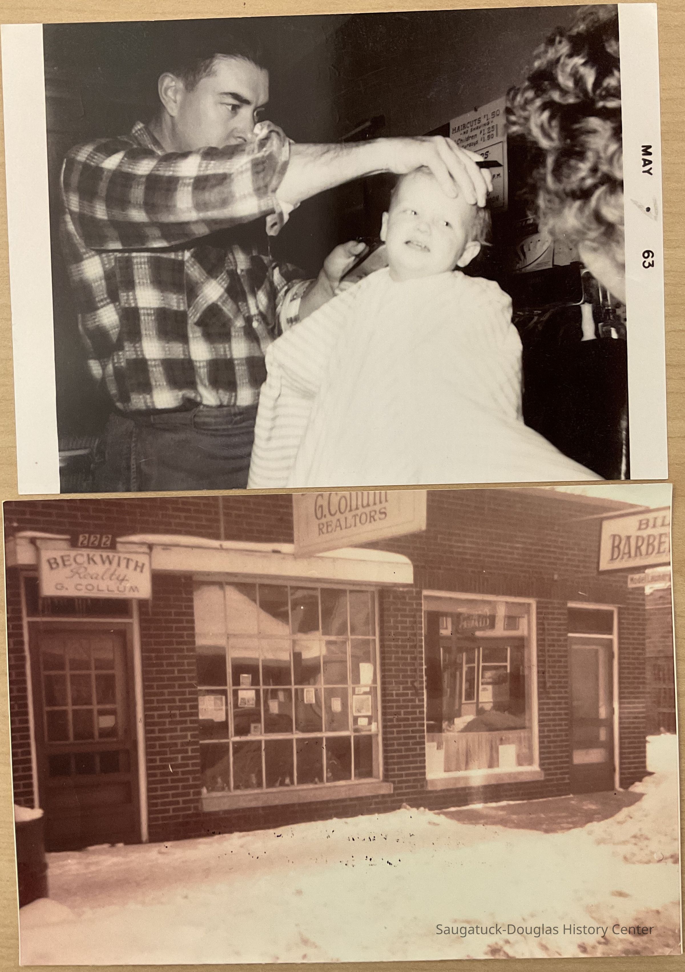 A photograph of William (Bill) L. Schumacher barber in Saugatuck in the 1960s he is cutting the hair of Daryl Grubbs (first haircut) May 7, 1963