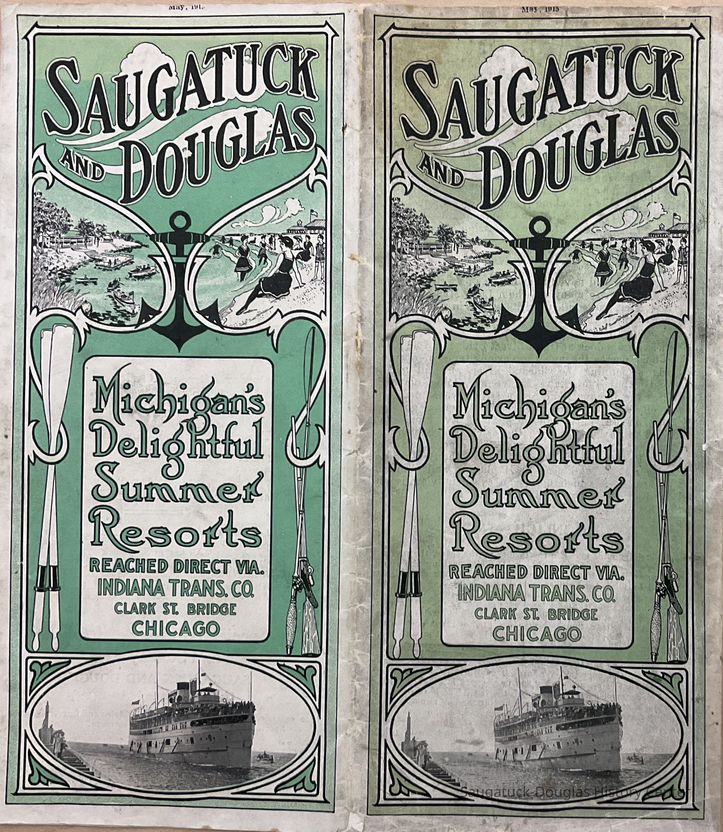 15-page brochure printed in 1915 by the Indiana Transportation Company telling all about the virtues of vacationing in Saugatuck and Douglas. Includes a list of hotels and tourist homes also a sailing schedule from Chicago. Maps include the Indiana Trans. Co.'s route across Lake Michigan and a detail map of Saugatuck-Douglas plus general information about traveling by steamship.Context