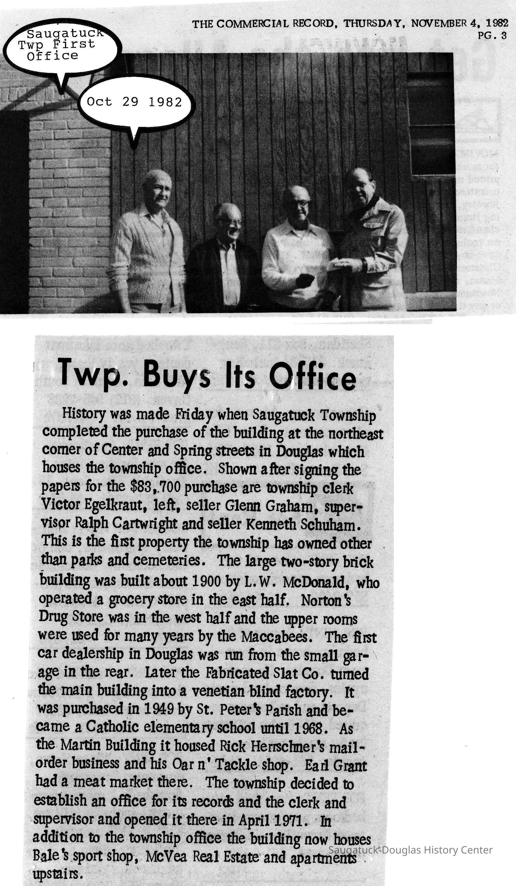 Digital scan of photos and clippings about the commercial building at the northeast corner of Center and Spring streets in Douglas.Photograph Details