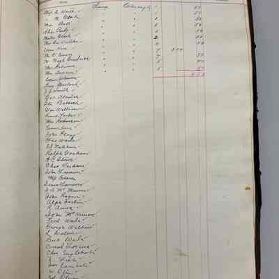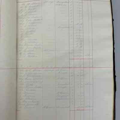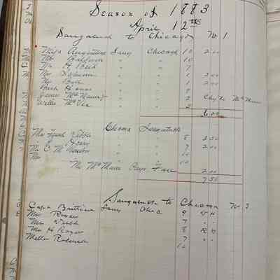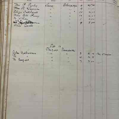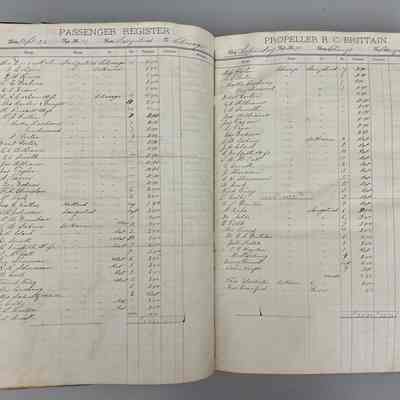 Large ledger with arched but detached spine and no cover. The ledger lists the passengers who traveled on the propeller ship (on innovation over sail power) R.C. Brittain.Context