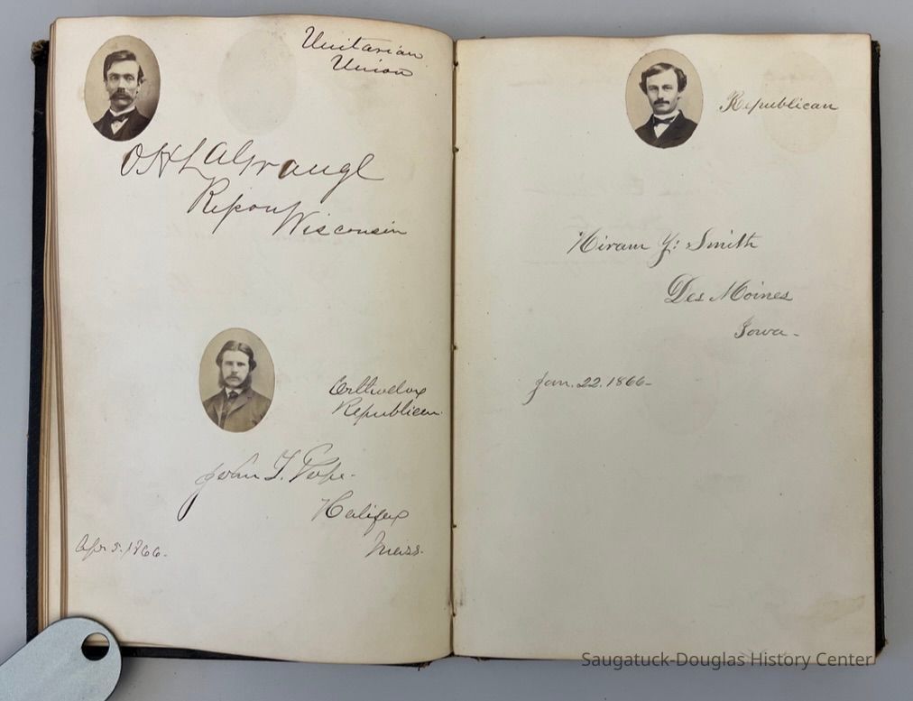 Autograph album dated 1866 Albany Law School with what seems to be class photos pasted on each page with the autograph.