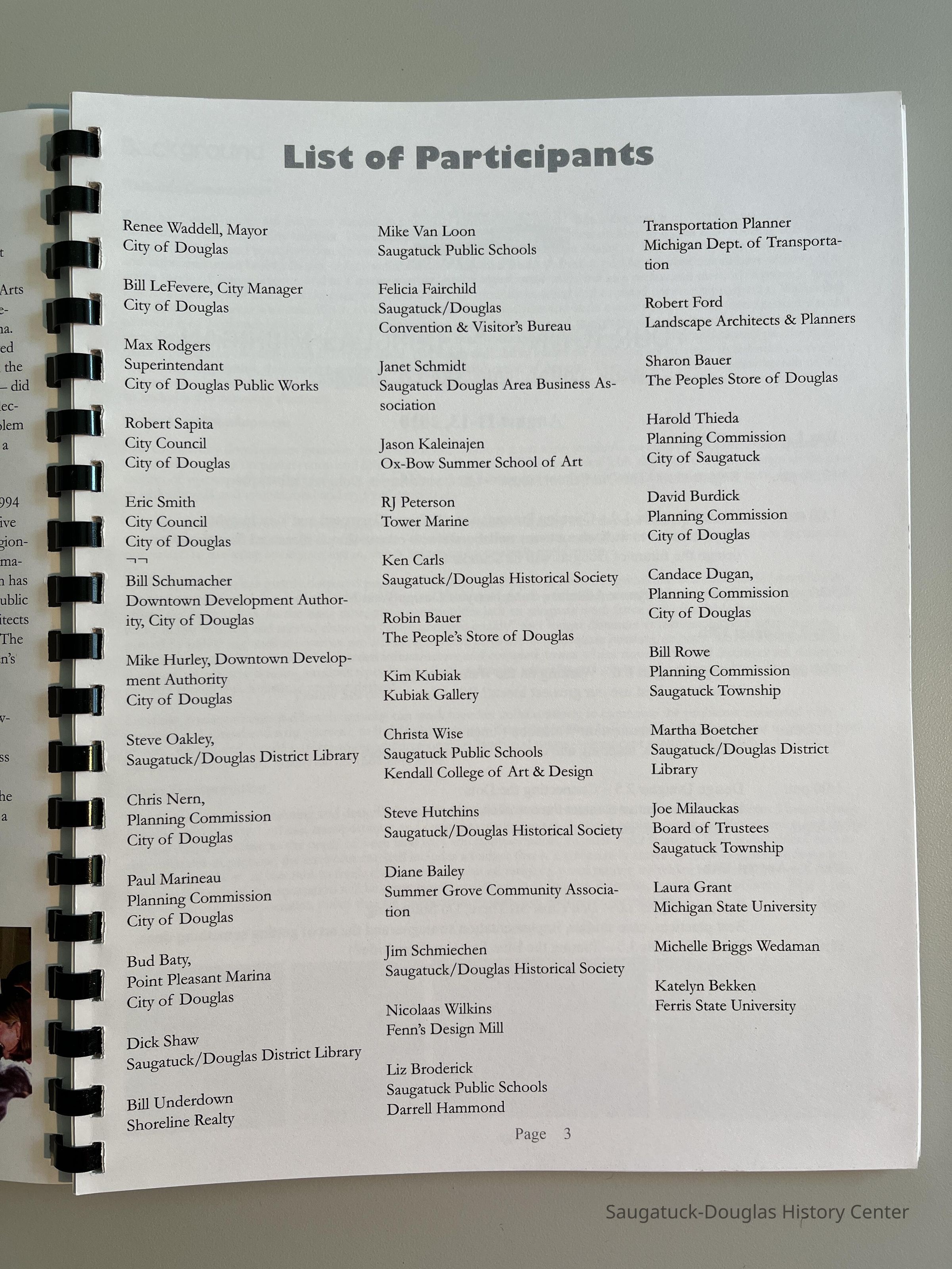 "Notebook on Rural and Waterfront Design for Douglas, Michigan" Black-comb-bound, 89-page, notebook produced by the Citizens' Institute on Rural Design for a workshop that occurred on August 11-13, 2010. The workshop was presented by John Berry of Douglas Design West.